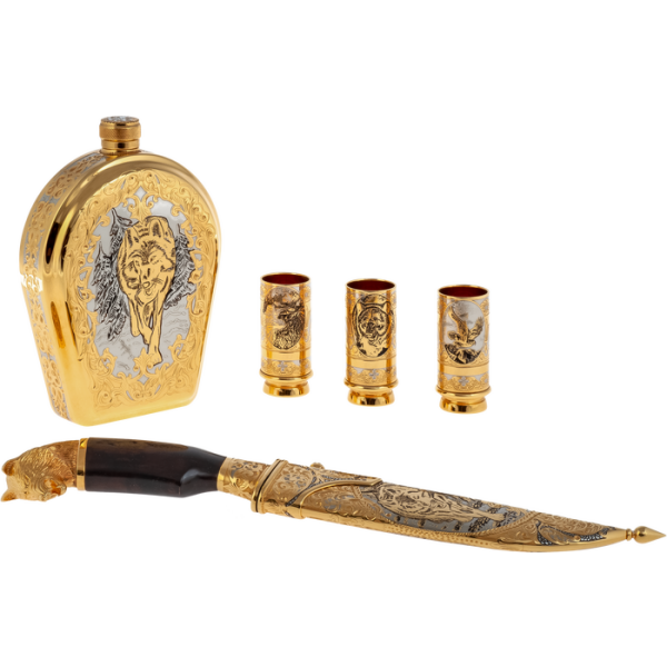 Эксклюзивные охотничьи наборы выполнены в технике Златоуста - национального художественного промысла. Ножи, стопки и принадлежности для охоты, покрытые платиной, золотом, серебром и никелем, украшены гравюрами Златоустовских мастеров. После того, как на полированную поверхность наносится изящный рисунок, изделие сушится в печи и подвергается травлению, после которого узор становится рельефным.