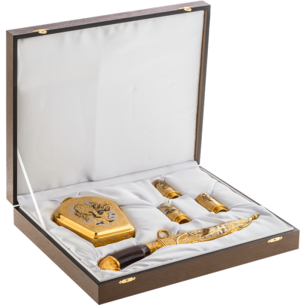 Секреты и тонкости этого искусства передаются из поколения в поколение, поэтому уникальные художественные изделия неповторимы. Охотничьи наборы можно украсить дарственной надписью с самыми лучшими пожеланиями виновнику торжества.