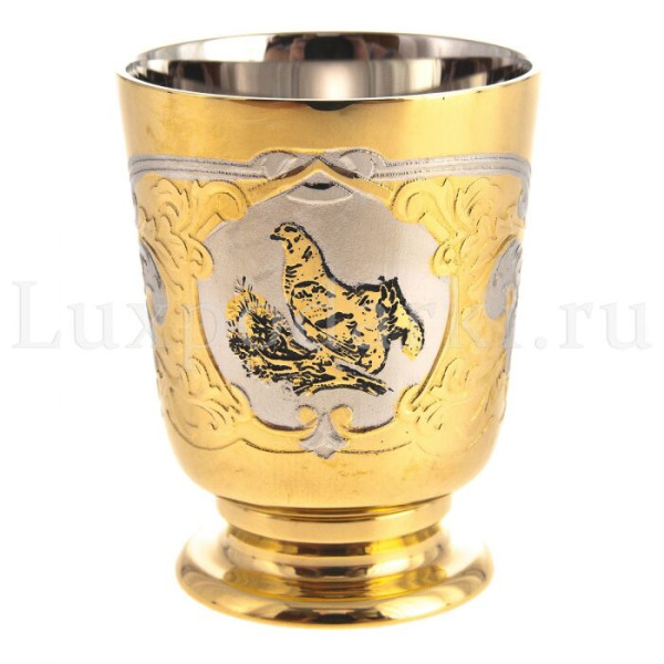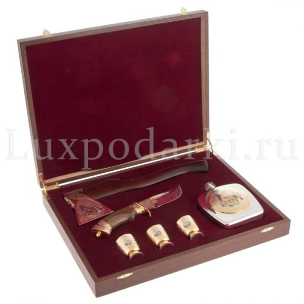 Эксклюзивные охотничьи наборы выполнены в технике Златоуста - национального художественного промысла. Ножи, стопки и принадлежности для охоты, покрытые платиной, золотом, серебром и никелем, украшены гравюрами Златоустовских мастеров. После того, как на полированную поверхность наносится изящный рисунок, изделие сушится в печи и подвергается травлению, после которого узор становится рельефным.