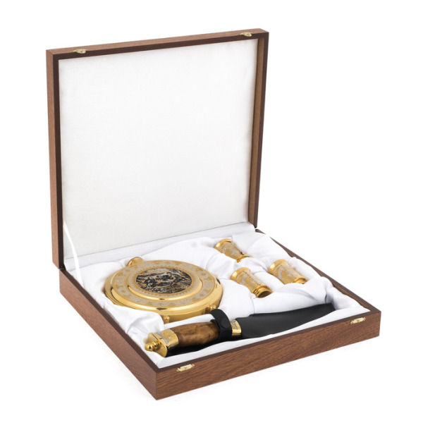 Секреты и тонкости этого искусства передаются из поколения в поколение, поэтому уникальные художественные изделия неповторимы. Охотничьи наборы можно украсить дарственной надписью с самыми лучшими пожеланиями виновнику торжества.
