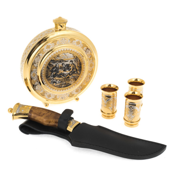 Эксклюзивные охотничьи наборы выполнены в технике Златоуста - национального художественного промысла. Ножи, стопки и принадлежности для охоты, покрытые платиной, золотом, серебром и никелем, украшены гравюрами Златоустовских мастеров. После того, как на полированную поверхность наносится изящный рисунок, изделие сушится в печи и подвергается травлению, после которого узор становится рельефным. Секреты и тонкости этого искусства передаются из поколения в поколение, поэтому уникальные художественные изделия неповторимы. Охотничьи наборы можно украсить дарственной надписью с самыми лучшими пожеланиями виновнику торжества.