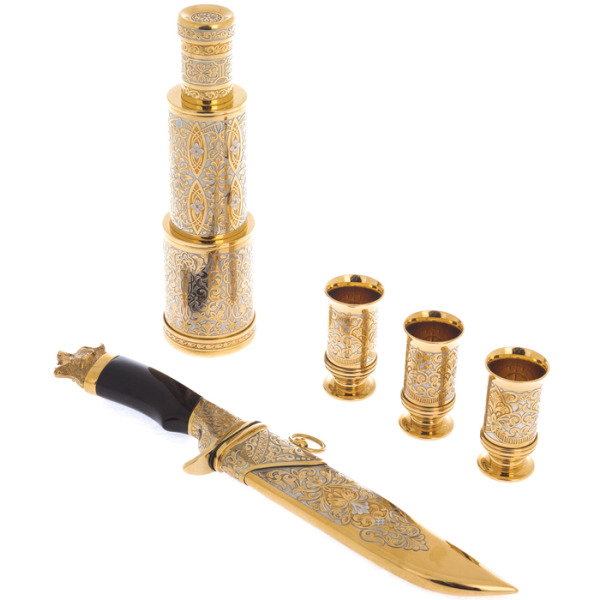 Эксклюзивные охотничьи наборы выполнены в технике Златоуста - национального художественного промысла. Ножи, стопки и принадлежности для охоты, покрытые платиной, золотом, серебром и никелем, украшены гравюрами Златоустовских мастеров. После того, как на полированную поверхность наносится изящный рисунок, изделие сушится в печи и подвергается травлению, после которого узор становится рельефным.