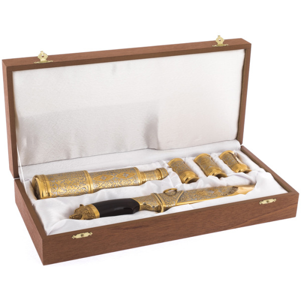 Секреты и тонкости этого искусства передаются из поколения в поколение, поэтому уникальные художественные изделия неповторимы. Охотничьи наборы можно украсить дарственной надписью с самыми лучшими пожеланиями виновнику торжества.