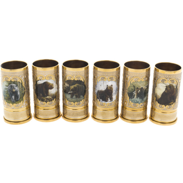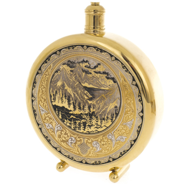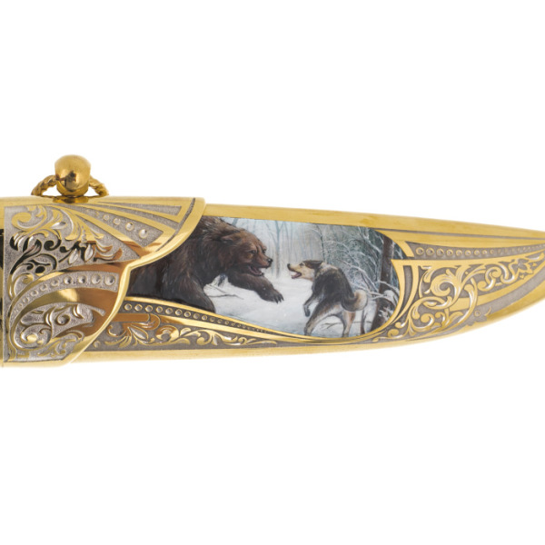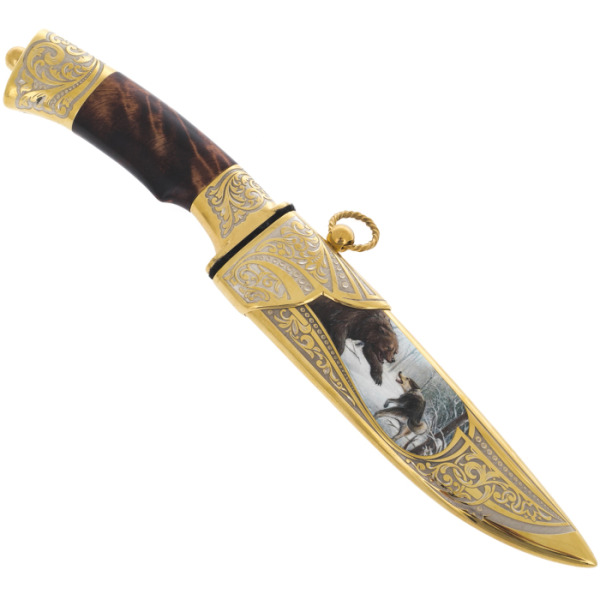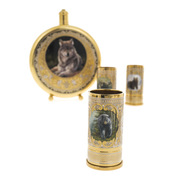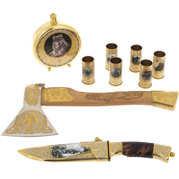 Эксклюзивные охотничьи наборы выполнены в технике Златоуста - национального художественного промысла. Ножи, стопки и принадлежности для охоты, покрытые золотом и украшены гравюрами Златоустовских мастеров. После того, как на полированную поверхность наносится изящный рисунок, изделие сушится в печи и подвергается травлению, после которого узор становится рельефным.