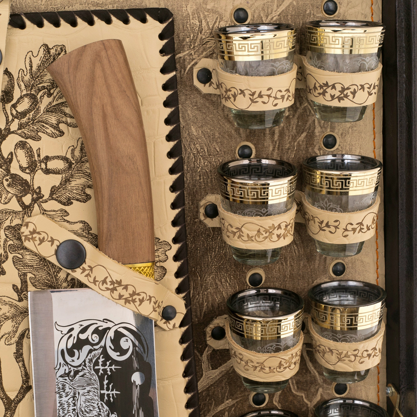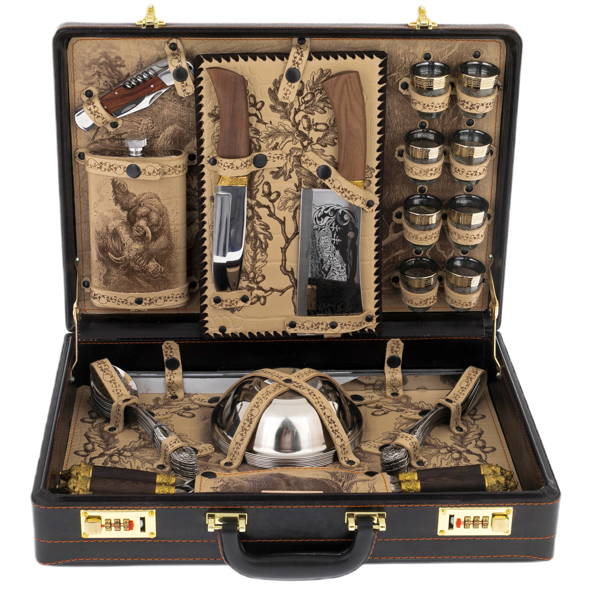 Изящные столовые приборы, выполненные из высококачественных материалов, подчеркивают внимание к деталям и способность ценить роскошь даже в самых простых удовольствиях. Шампуры и ножи олицетворяют силу и решимость, которые всегда сопровождают вас, независимо от того, где вы находитесь — в деловом мире или на отдыхе. Роскошный кейс из экокожи украшен ручной росписью, которой, по желанию клиента, можно нанести логотип, поздравительную надпись или красивый рисунок.