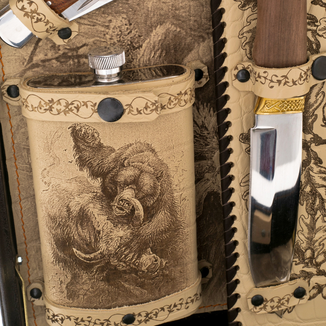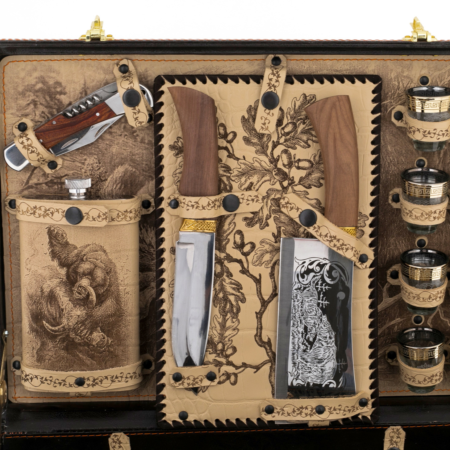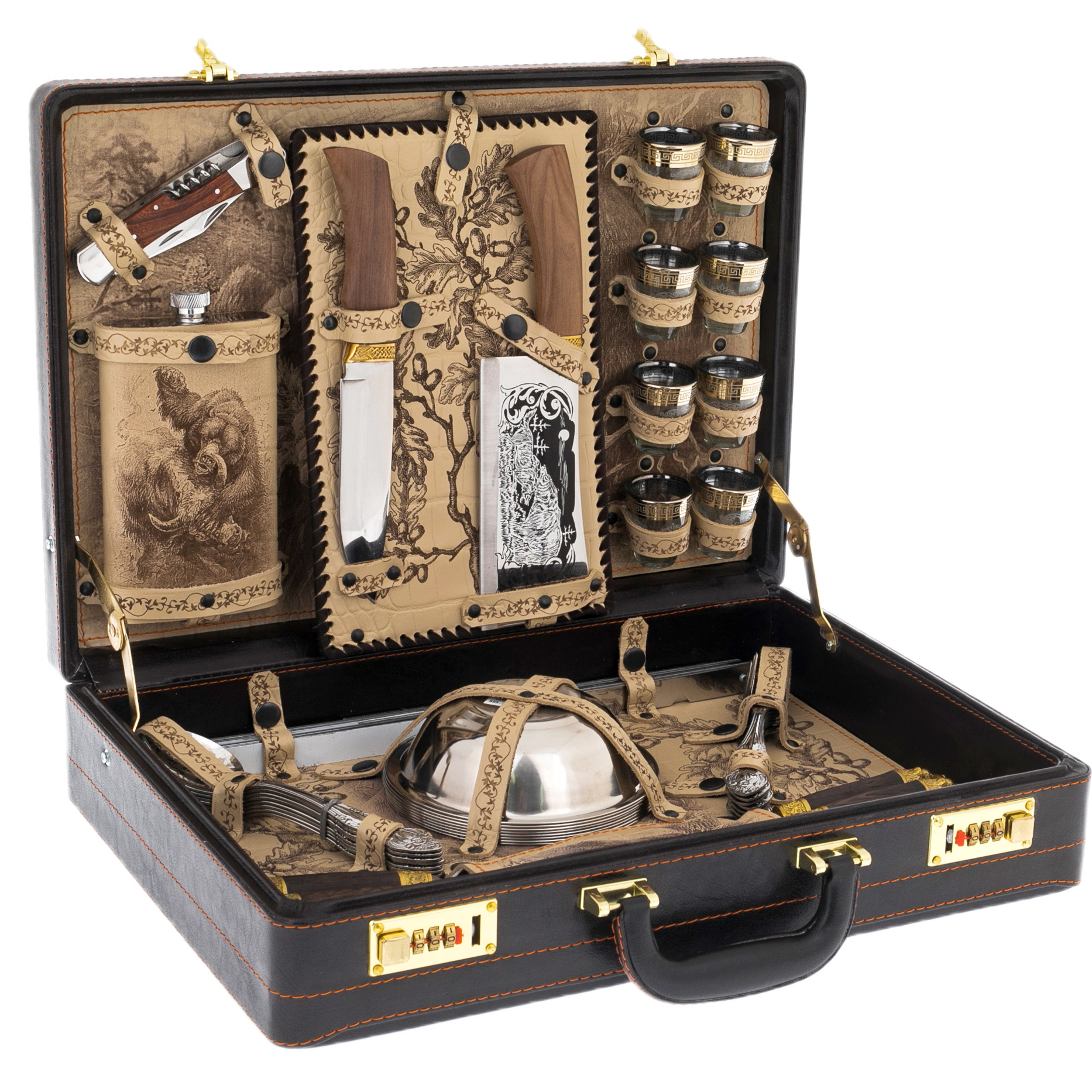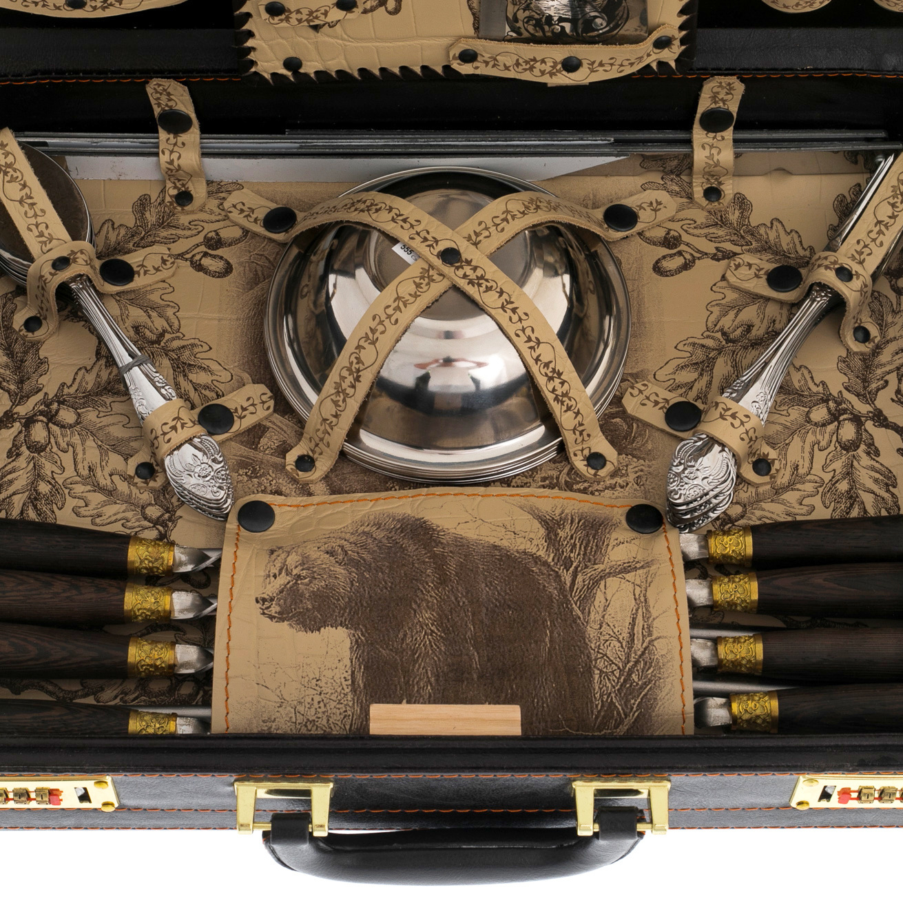 Набор для пикника "Медведь" на 8 персон — это больше, чем просто аксессуар для отдыха на природе, это воплощение истинного лидерства и контроля над деталями. Это красивый и функциональный комплект в дизайнерском исполнении для любителей дачных посиделок у костра. В комплект входят стальная фляжка, мангал и шампуры, охотничий нож и нож-тяпка для рубки мяса, зажигалка и рюмки, вилки, ложки и тарелки — с таким набором можно устроить загородное застолье по высшему классу. Каждая составляющая говорит о высоком статусе владельца и его стремлении к совершенству.