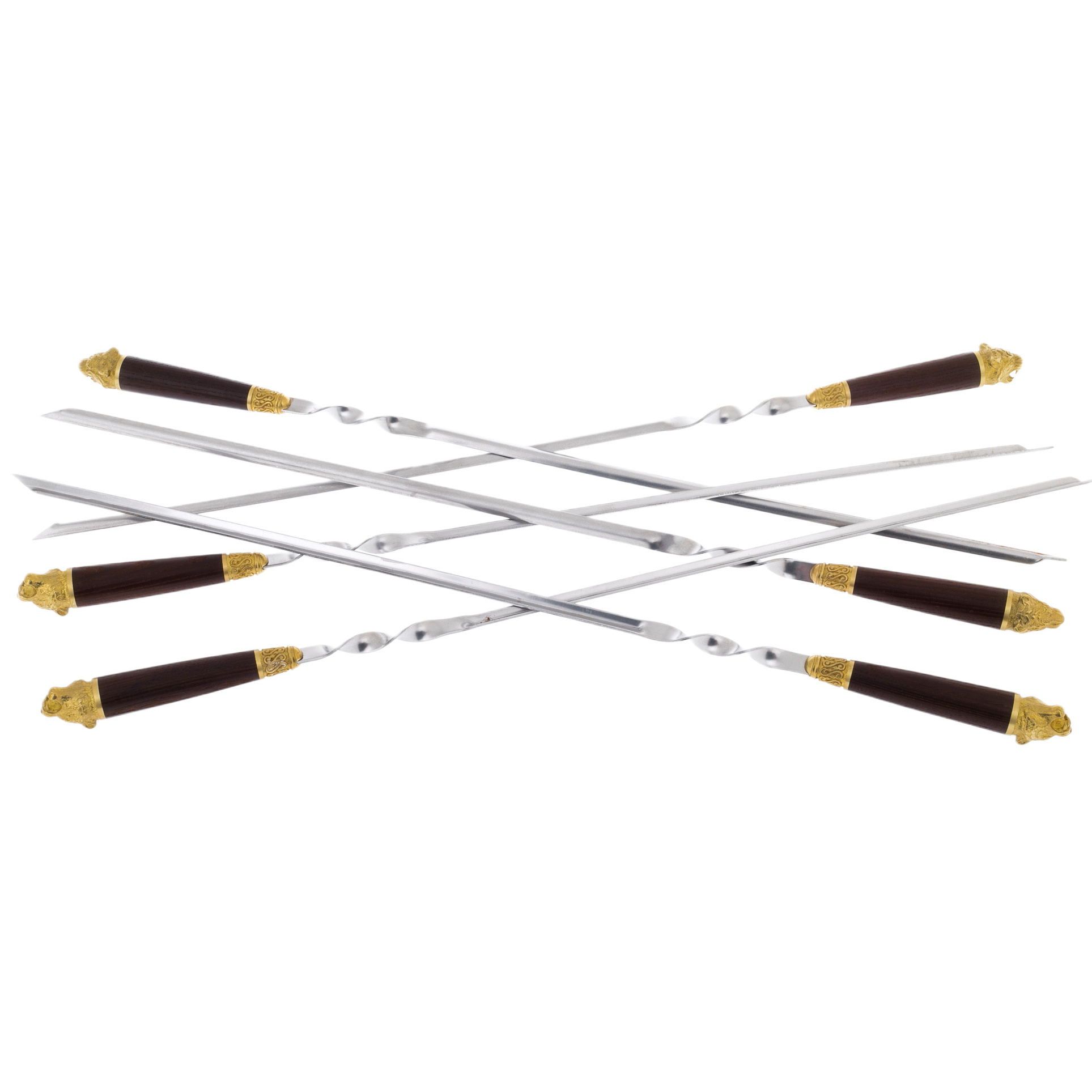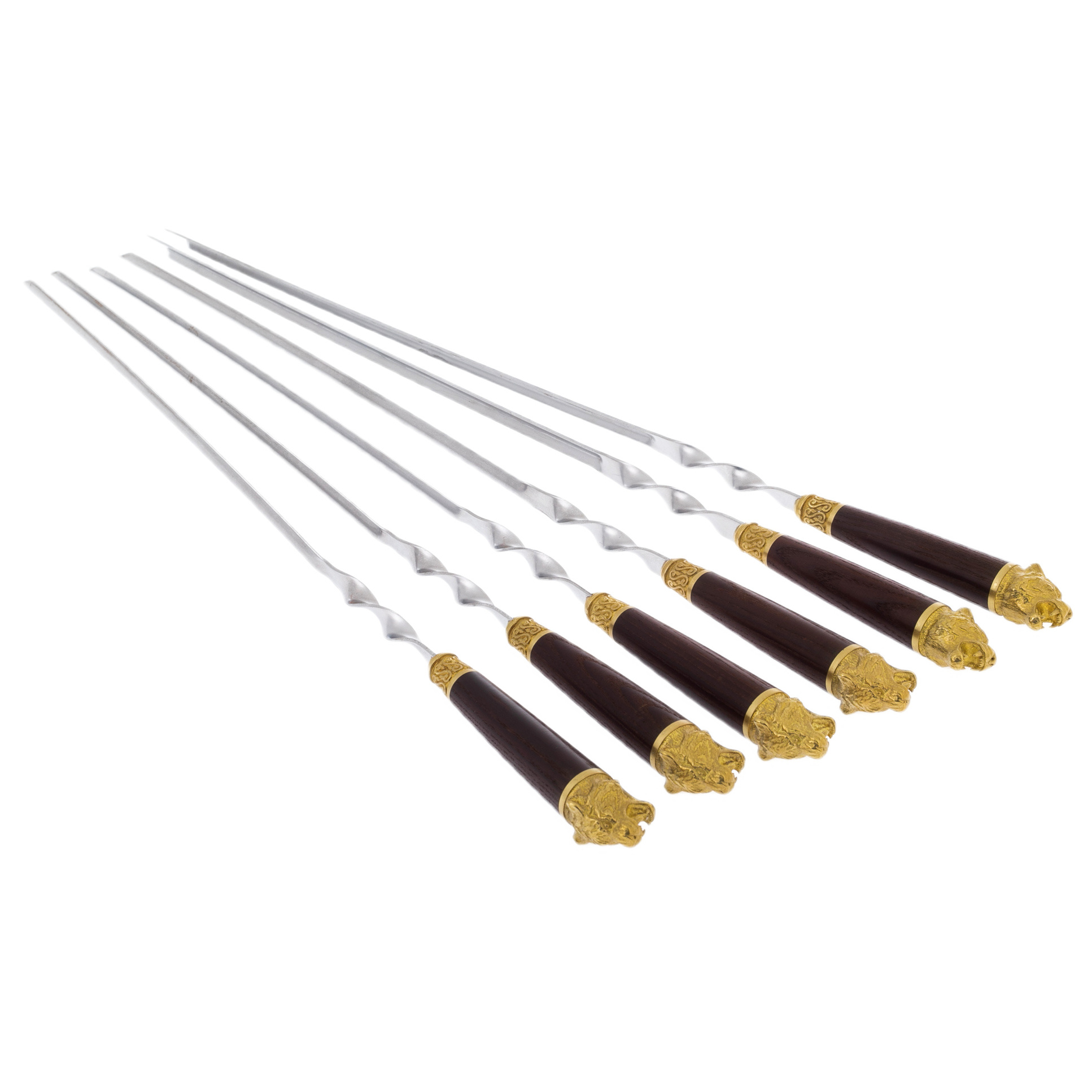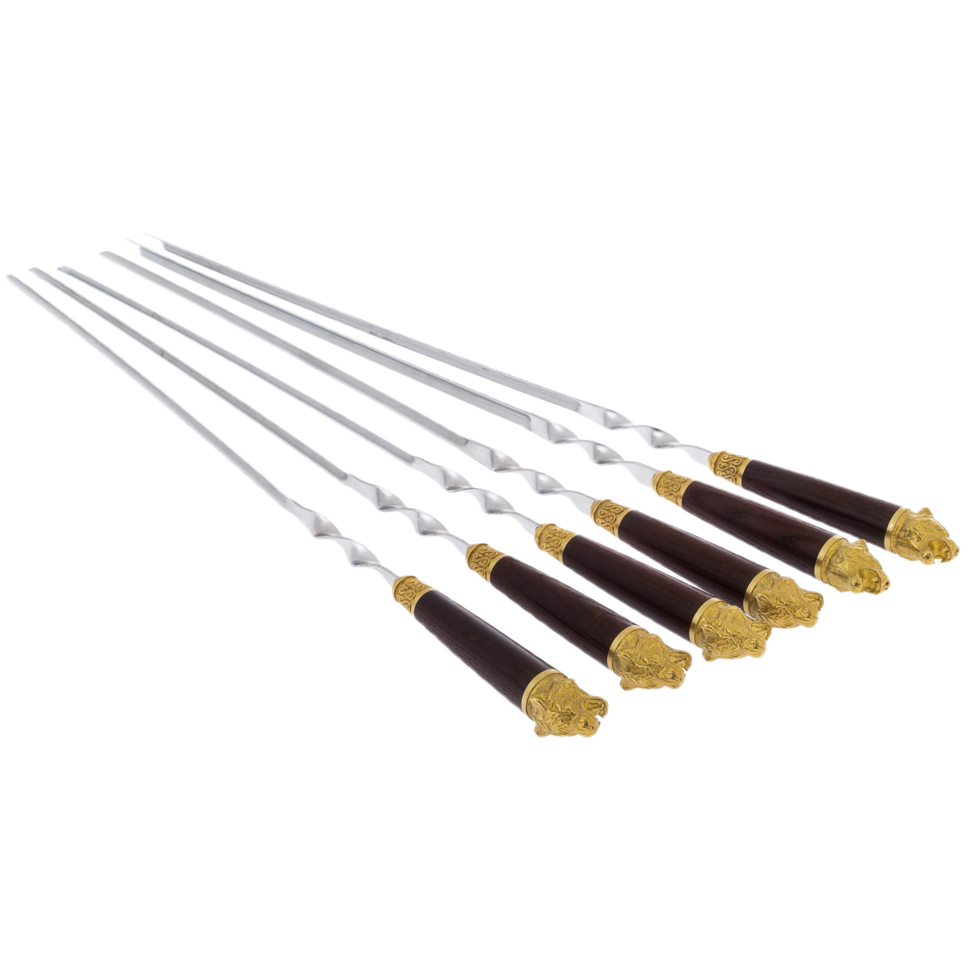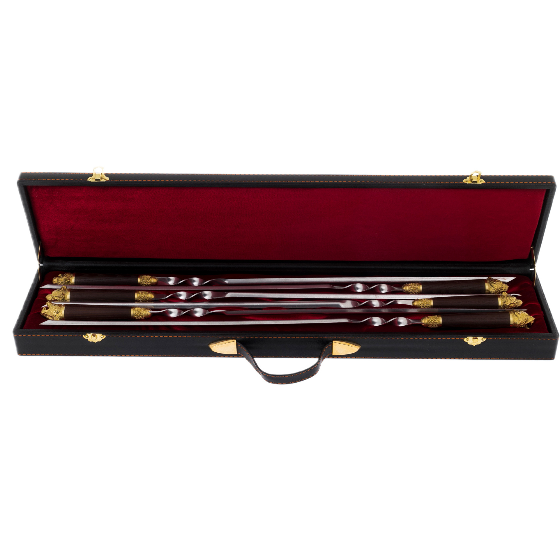 Подарочный набор для для шашлыка – красивый и функциональный сувенир в дизайнерском исполнении для любителей отдыха на природе. В набор входят прочные шампуры с рукоятью из бронзы и кейс из экокожи. Рукоять каждого шампура украшена скульптурной художественной композицией, изображающей дикого лесного зверя. На кейс по желанию клиента можно нанести логотип, поздравительную надпись. Набор для пикника превратит любую поездку за город в праздник!