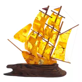 Использование янтаря придаёт этому сувениру особую глубину. Каждый фрагмент корабля выполнен из природного камня возрастом миллионы лет, сформированного из окаменевшей смолы древних хвойных лесов. Янтарь наделён магнетизмом и теплом, храня в себе солнечную энергию прошлого. Он издревле считался символом удачи в морских путешествиях и мощным оберегом, особенно в формах, связанных с движением, дорогой, ветром. Его прозрачные и полупрозрачные участки, насыщенные оттенками от меда до коньяка, создают многослойный эффект — как будто корпус судна и паруса дышат светом.