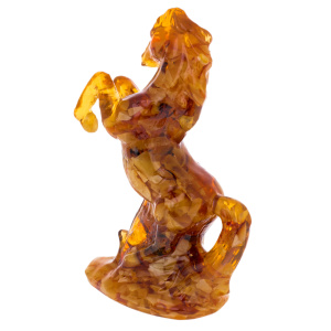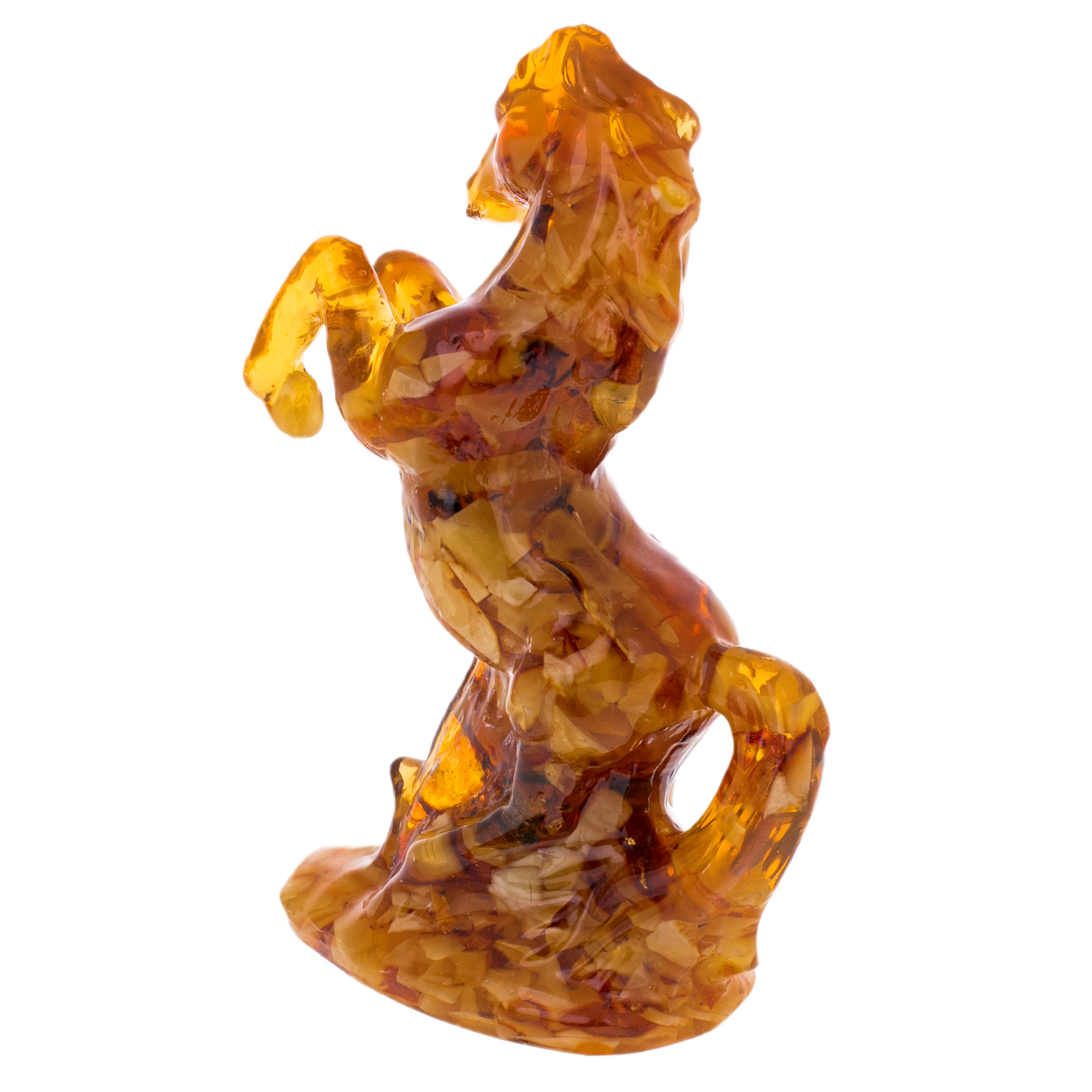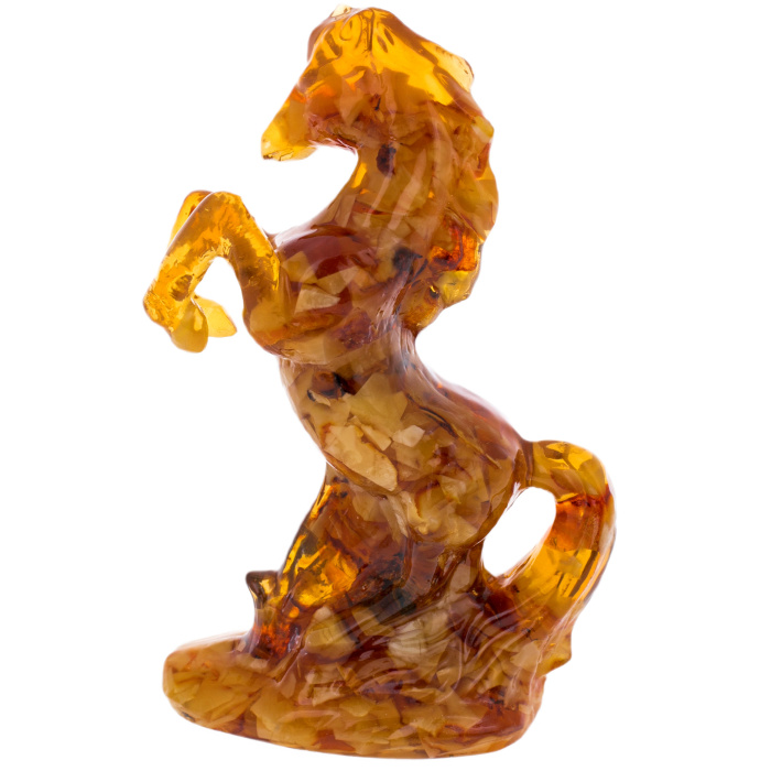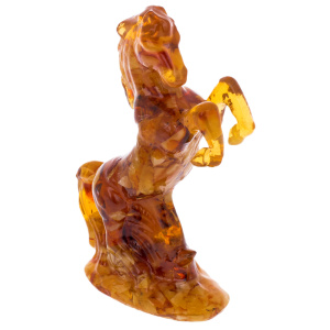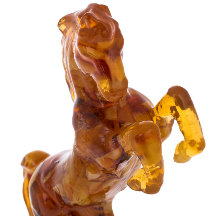 Скульптура выполнена из цельного массива янтаря тёплой медово-коньячной гаммы с естественными переливами, переходами от прозрачных золотистых участков к более насыщенным, карамельно-тёмным зонам. Полировка подчёркивает глубину камня: внутри читаются природные слои и световые вспышки, напоминающие застылые языки пламени, а на поверхности проявляются мягкие отражения, усиливающие ощущение "живого" материала. Резьба передаёт основные анатомические акценты: объёмная грудь, сильная линия крупа, намёк на гриву, обозначенные рельефом мышцы, прорисованные складки, поддерживающие динамику позы. Основание слито с фигурой в единый монолит, расширяясь книзу и обеспечивая устойчивость, при этом сохраняется ощущение лёгкости за счёт прозрачных участков янтаря, пропускающих свет.