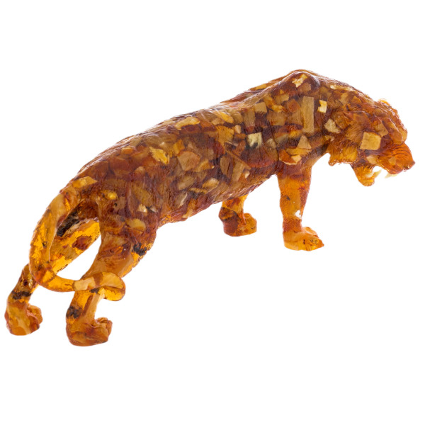 Полупрозрачная текстура янтаря раскрывает игру света и тени, создавая ощущение, будто тигр обретает жизнь при каждом взгляде на него. Его мускулистое тело, тщательно проработанное мастером, демонстрирует грацию и силу хищника, готового к прыжку. Грива огненных оттенков придает статуэтке дополнительный элемент мощи, превращая ее в символ природной власти и безграничной уверенности.