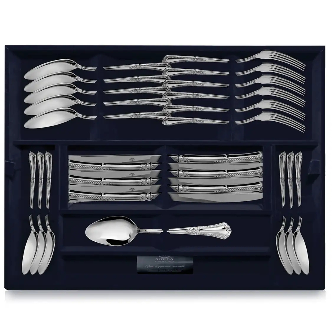 АргентаСеребряный столовый набор "Визит": вилка, ложка, нож, чайная ложка, на 12 персонСеребряный столовый набор "Визит": вилка, ложка, нож, чайная ложка, на 12 персонКоллекция классического столового серебра - это союз многовековых традиций и современных технологий, эстетичных форм и эргономичного дизайна. Все предметы коллекции созданы, чтобы стать заветными семейными ценностями и передаваться из поколения в поколения. Стильные и полезные, серебряные столовые приборы помогают победить негативное воздействие внешней среды и укрепляют иммунитет всей семьи день за днём. Классическая коллекция состоит из нескольких линий классического столового серебра: Фаворит, Император, Престиж, Визит, Русский, Единство, Элегант, Морозко, Фамильный. В каждой линии предусмотрены разные варианты для покупки. Вы можете приобрести любое изделие отдельно или набор на одну или несколько персон. Для больших семейств и крупных застолий - наборы из 24, 48, 51 и более предметов. Все изделия коллекции Classic являются неотъемлемой частью сервировки как праздничного, так и повседневного стола.