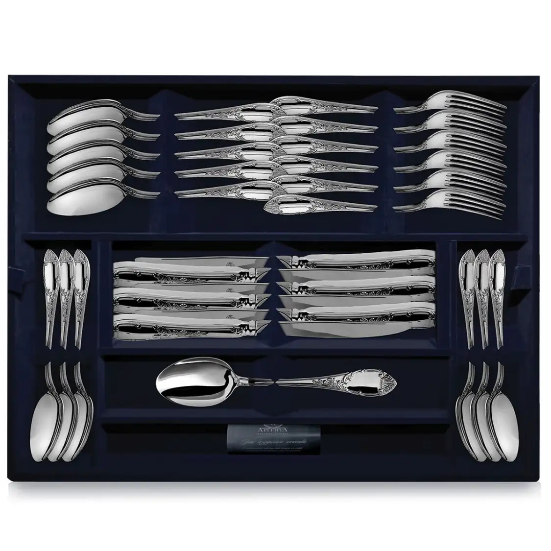 Комплектация:6 десертных ложек, 6 десертных вилок, 6 десертных ножей, 6 чайных ложек, футляр.