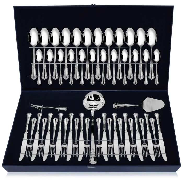 Серебряный столовый набор "Фаворит" : вилка, вилка для лимона, ложка, нож, половник, совок для сахара чайная ложка, на 12 персон