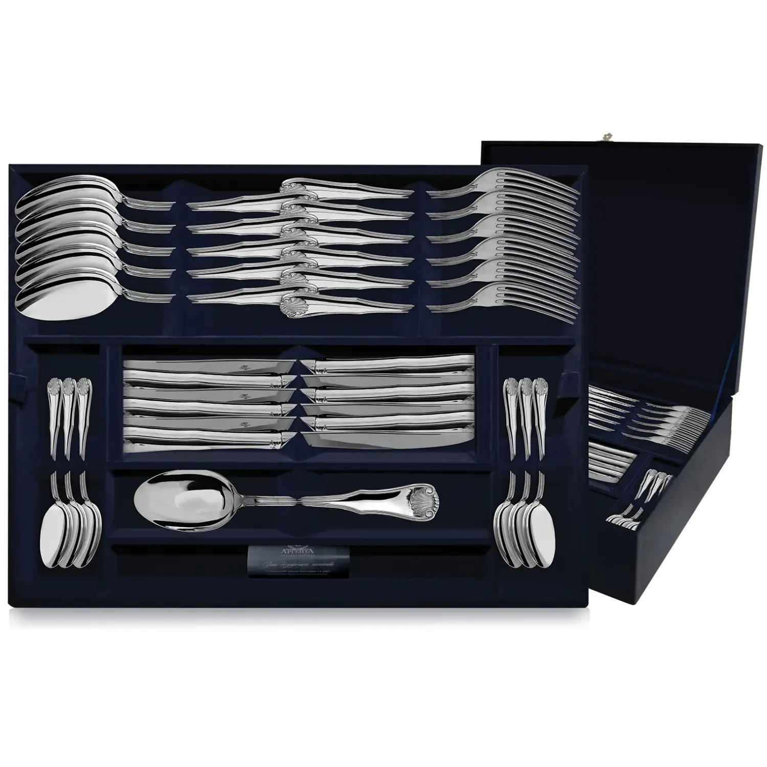 Комплектация:12 столовых вилок, 12 столовых ножей, 12 столовых ложек, 12 чайных ложек, футляр.