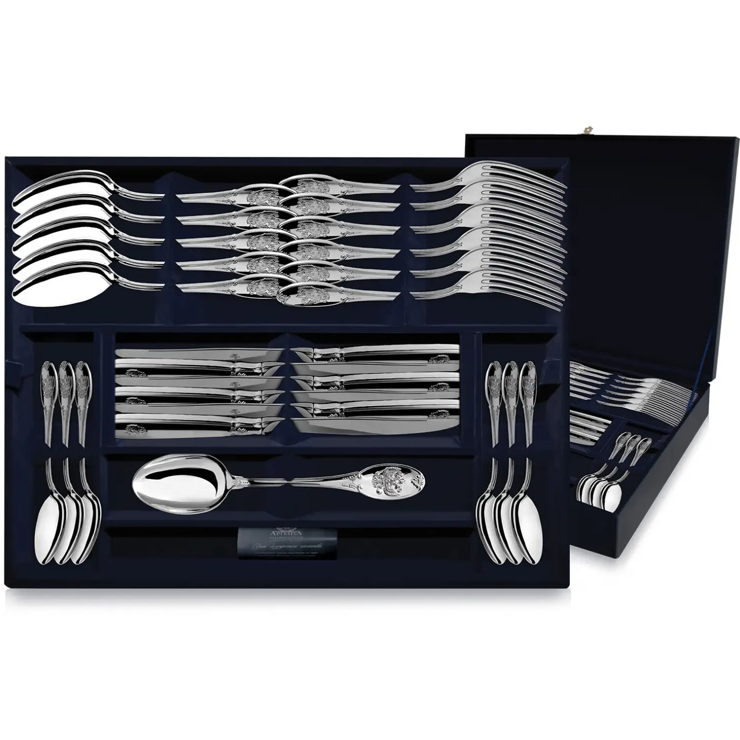 Комплектация:6 столовых ложек, 6 столовых вилок, 6 столовых ножей, 6 чайных ложек, футляр.