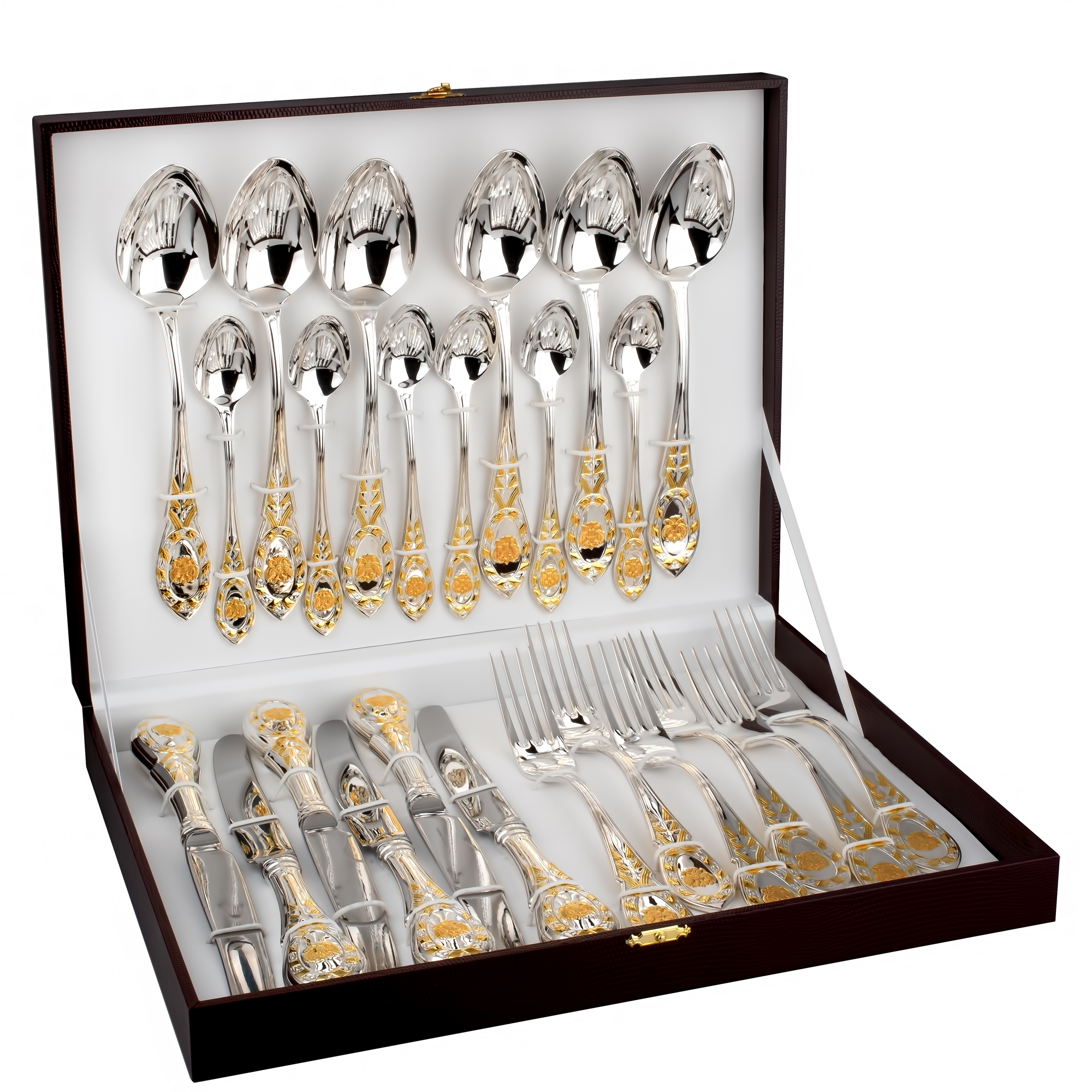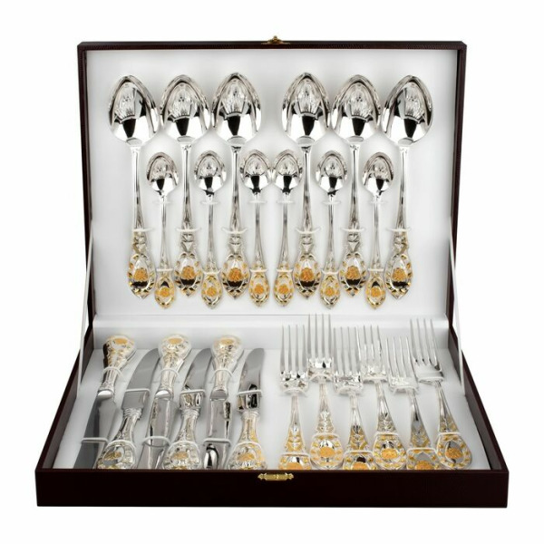 Столовый набор из серебра с золочением "Государственный Герб РФ" 24 предмета, на 6 персон