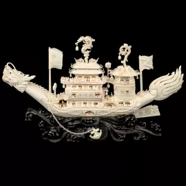 Корабль-дракон из бивня мамонта "Хуафанг" с кантонским шаром, большой Корабль-дракон из бивня мамонта "Хуафанг" с кантонским шаром, большой Творческий замысел: форма произведения величественна и гармонична. В работе использован широкий спектр традиционных техник — круглая резьба, рельеф, сквозная ажурная проработка, сложные многоярусные композиции и мозаичные элементы. Все детали исполнены с исключительной точностью и вниманием к мельчайшим нюансам. Три павильона последовательно поднимаются и опускаются, создавая ощущение движения и многослойности пространства. В композиции — почти 3000 тщательно проработанных фигур, каждая из которых обладает индивидуальными чертами и характером. Сцены празднества и народных развлечений придают работе динамику и насыщенность. Благоприятный дракон с высоко поднятой головой, исполненный внутреннего достоинства, символизирует смелость движения вперёд и предвещает удачное, благополучное плавание. Более двухсот открывающихся окон и свыше ста колокольчиков, приходящих в движение от лёгкого ветра, усиливают эффект живого архитектурного ансамбля. Масштаб замысла и виртуозность исполнения производят сильное впечатление, заставляя вновь и вновь возвращаться к созерцанию этого произведения.