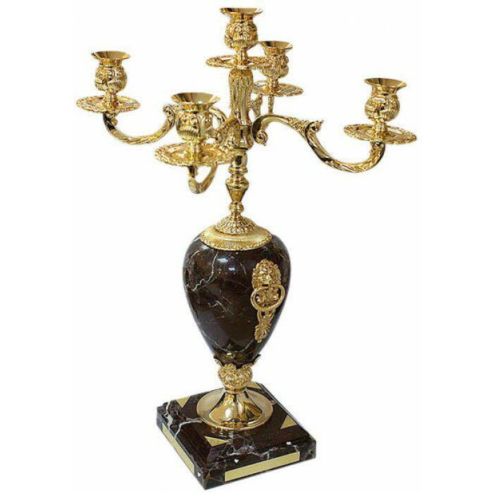 Подсвечник на пять свечей «Villa Oleandra» — это торжественная классика в её монументальном воплощении. Основание из полированного натурального мрамора насыщенного тёмного оттенка придаёт композиции визуальную устойчивость и весомость. Гладкая поверхность камня с живыми природными прожилками контрастирует с изысканным литьём позолоченной бронзы, охватывающей вазообразную центральную часть изящными львиными маскаронами. Каждый элемент конструкции отлит и отделан вручную, с филигранной проработкой орнамента в стиле Людовика XVI.