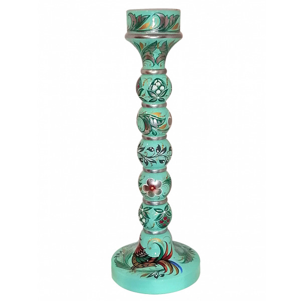 Изготовлен в полном соответствии с традиционной хохломской технологией золочения. Выточен из цельного дерева вручную. Имеет авторскую роспись в технике фонового письма. Роспись «Райские птицы». Лаковое покрытие делает изделие влагозащищенным и износоустойчивым. Все применяемые при производстве материалы натуральны и экологичны. Подсвечник является универсальным подарком, который обеспечит все необходимое для создания романтической обстановки в доме, а также служит элементом декора помещения. На каждом изделии имеется подпись автора росписи.