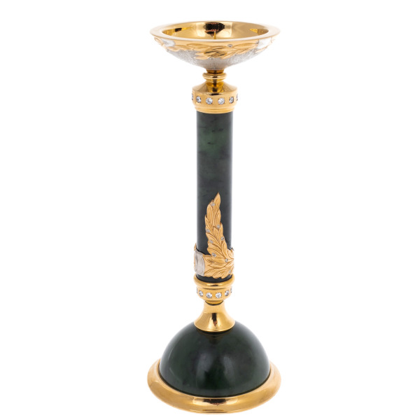 Подсвечник из нефрита, рождённый в мастерских Златоуста, восхищает сочетанием лаконичной формы и утончённой роскоши. Массивное основание из тёмно-зелёного полированного нефрита венчает изящный стержень, украшенный рельефным золотым листом — символом триумфа и вечности. Верхняя чаша из латуни и мельхиора покрыта гальваническим золотом, сияющим в свете пламени, словно отражающим силу древнего ритуала. Обрамление кристаллами подчёркивает благородство формы и завершённость образа, не допускающего компромиссов.