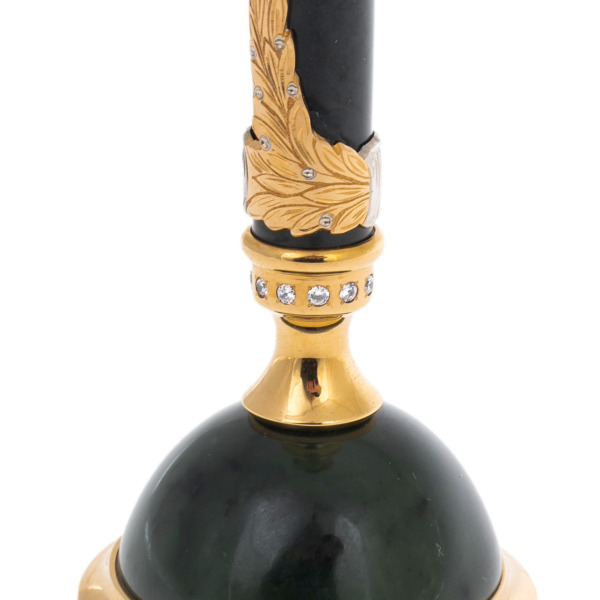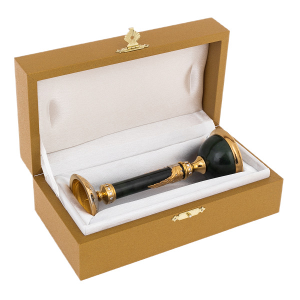 Сочетание камня и металла выполнено с ювелирной точностью, достойной царских интерьеров. В отделке используется гравировка, ручная шлифовка и филигранная инкрустация сверкающими фианитами. Каждый декоративный элемент вмонтирован с безупречным вкусом, подчёркивая уникальность предмета. Златоустовские мастера вложили в эту вещь не только своё мастерство, но и философию созерцательной силы: нефрит символизирует внутреннюю гармонию, а золото — вечную власть и непреложную истину.