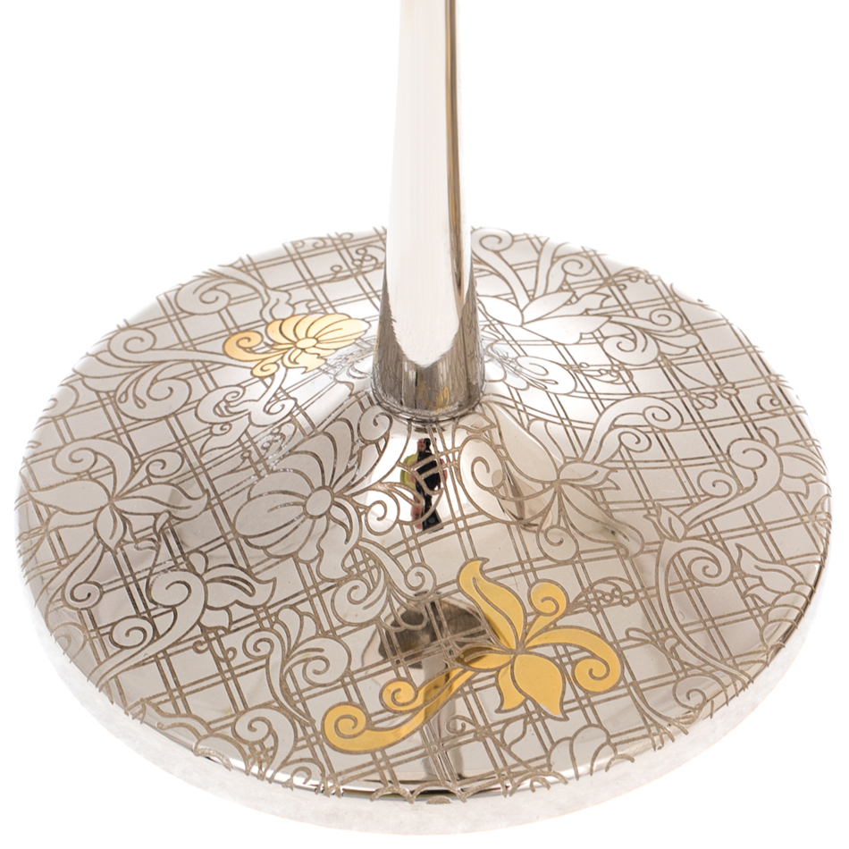 Мастера Златоустовской оружейной школы украсили каждое основание филигранной гравировкой с золотыми акцентами: растительные мотивы, проработанные до мельчайших завитков, придают предмету легкость и тонкость. Техника никелирования и золочения подчёркивает благородный блеск металла, создавая игру света и отражений.
