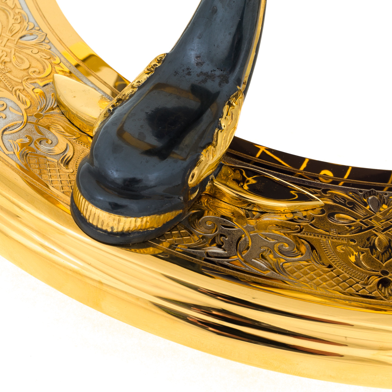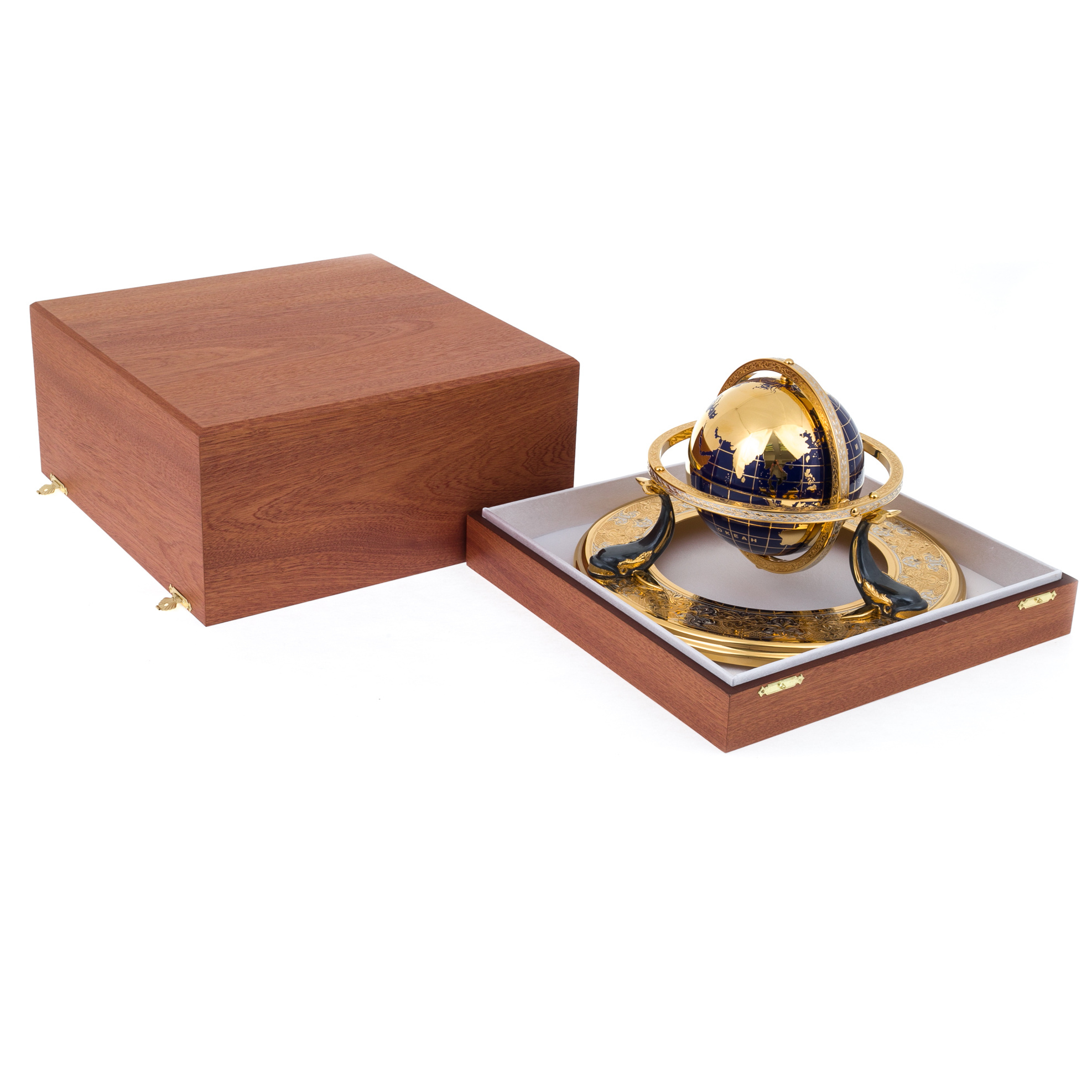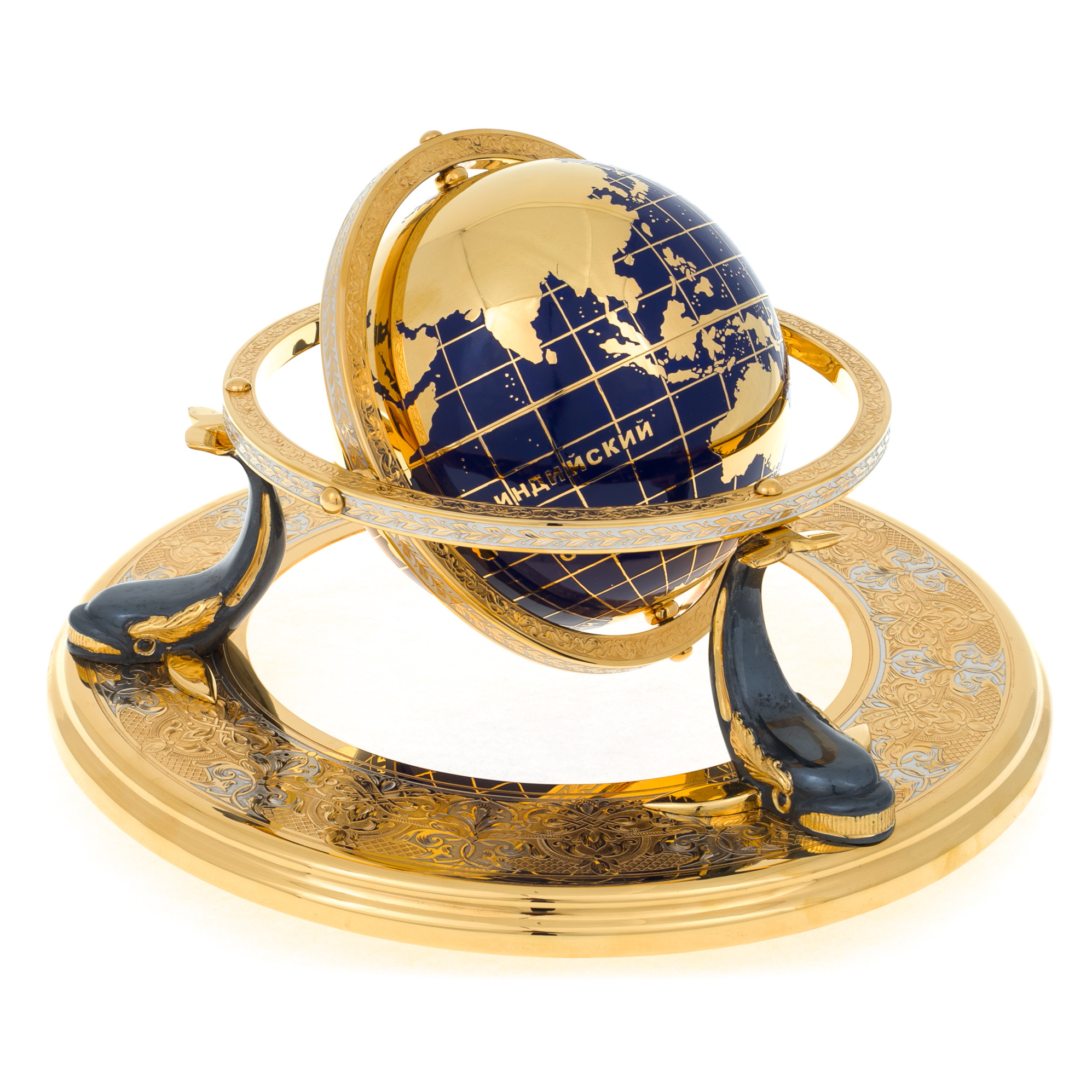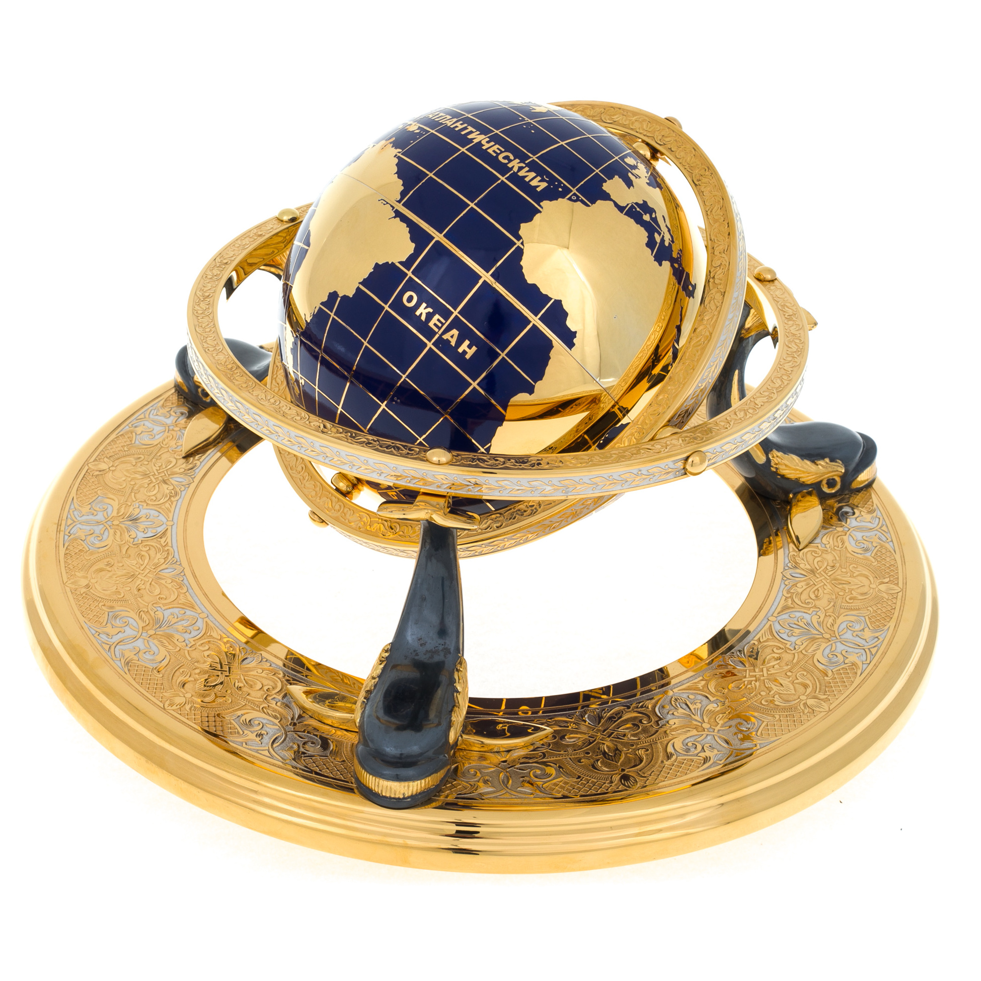 Глобус ручной работы от мастеров Златоуста идеально впишется в любой интерьер. Такой сувенир понравится любителям изделий ручной работы и подчеркнёт безупречный вкус владельца. Земной шар, который удерживают три мощных кита, символизирует древние представления об устройстве нашего мира. Выглядит композиция очень живописно, а за счёт фрагментов из золота - ещё и роскошно.