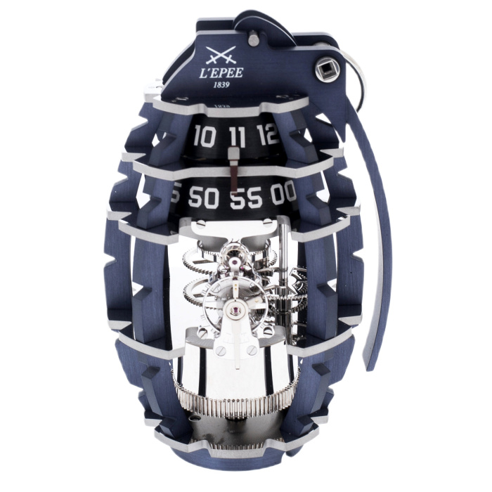 Эксклюзивные настольные часы "Grenade" черные Эксклюзивные настольные часы "Grenade" черные Grenade — это механический шедевр, сочетающий в себе совершенство часового дела с призывом вытащить чеку и жить настоящим! Граната переосмыслена в уникальное произведение искусства, символизирующее непредсказуемость жизни. Инновационные часы, вдохновленные искусством и историческими объектами, Grenade — это компактные настольные и каминные часы, которые бросают вызов тому, как время влияет на нашу жизнь, поскольку мы часто поглощены насущной необходимостью заполнить наши графики бесконечными задачами, подавляющими наши дни. Граната смоделирована по образцу исторической гранаты MKII с предохранителем M6A4C, в котором используется штифт, за который вытягивают, чтобы активировать взрывчатку. Аналогичным образом, L'Epée 1839 Grenade имеет штифт, который одновременно служит ключом, который при вытягивании позволяет установить время и завести восьмидневный механизм. В тот момент, когда вы выдергиваете чеку из гранаты, разум сфокусирован: граната активна, и вы должны сосредоточиться на том, что происходит здесь и сейчас, чтобы выжить. Граната от L'Epée 1839 дает аналогичный эффект, когда вы вытаскиваете ее чеку. Вы можете изменить время на то, что хотите, и, заводя заводную пружину, вы даете ей возможность направлять это время. Часы заставляют разум сосредоточиться на том моменте, в котором вы находитесь, и на задаче подзавода и установки времени, напоминая вам, что вам гарантирован только этот самый момент, так что не теряйте его впустую. Часы и минуты отображаются на двух черных алюминиевых дисках, вращающихся прямо над бьющимся сердцем Grenade. Отсчитывая традиционные 18 000 полуколебаний в час, баланс находится спереди и по центру, слышно напоминая нам, что время уходит, и мы никогда не знаем, сколько времени у нас осталось. После того, как вы заведете Grenade и настроите отображение времени, следующим шагом будет захват дня. Мастера-часовщики L'Epée 1839 постарались создать устройство, которое не только точно и стабильно показывает время, но и привлекает внимание в вашем доме. Grenade — это не просто привлекательные часы: это опыт.  Компания L’Epée1839, специализирующаяся на производстве элитных часов, понимающая тонкости часового дела, предлагает разнообразную коллекцию современных настольных часов. Поскольку изготовление часов — не самое простое искусство, компании L’Epée пришлось преодолеть немало преград на пути к созданию самого лучшего, успешно объединяя простой дизайн с техническим сложным исполнением.  Часы выпущены ограниченным тиражом по 99 штук каждого цвета.