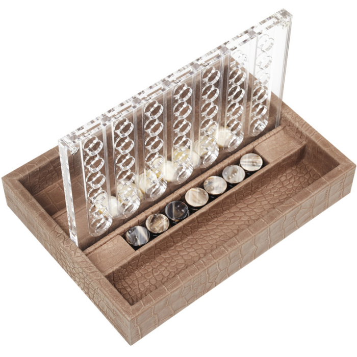 Hector Saxe Paris Эксклюзивная настольная игра "Четыре в ряд" из кожи Alligator, коричневый Эксклюзивная настольная игра "Четыре в ряд" из кожи Alligator, коричневый Эта вневременная игра стала уникальным и модным произведением искусства благодаря основе из кожи аллигатора, плексигласу и перламутровыми фишками. Он обязательно понравится всем и идеально впишется в ваш интерьер. Hector Saxe - французский бренд, специализирующийся на производстве элитных настольных игр и дизайнерских наборов ручной работы. В их ассортименте представлены нарды, игральные кости, наборы карт для покера, шахматы, домино, целая коллекция аксессуаров и шкатулок для хранения ювелирных украшений, часов, банковских карт. Творения бренда обожают за их элегантный дизайн и изысканный выбор материалов. Для создания своих шедевров мастера используют лучшие сорта итальянской кожи, редкие породы дерева, алькантару (износостойкую искусственную замшу). Чтобы в полной мере ощутить особенность продуктов французской марки, к ним необходимо прикоснуться, взять в руки, рассмотреть. Изготовлено вручную во Франции, в лучших парижских мастерских. Поставляется в подарочной коробке.