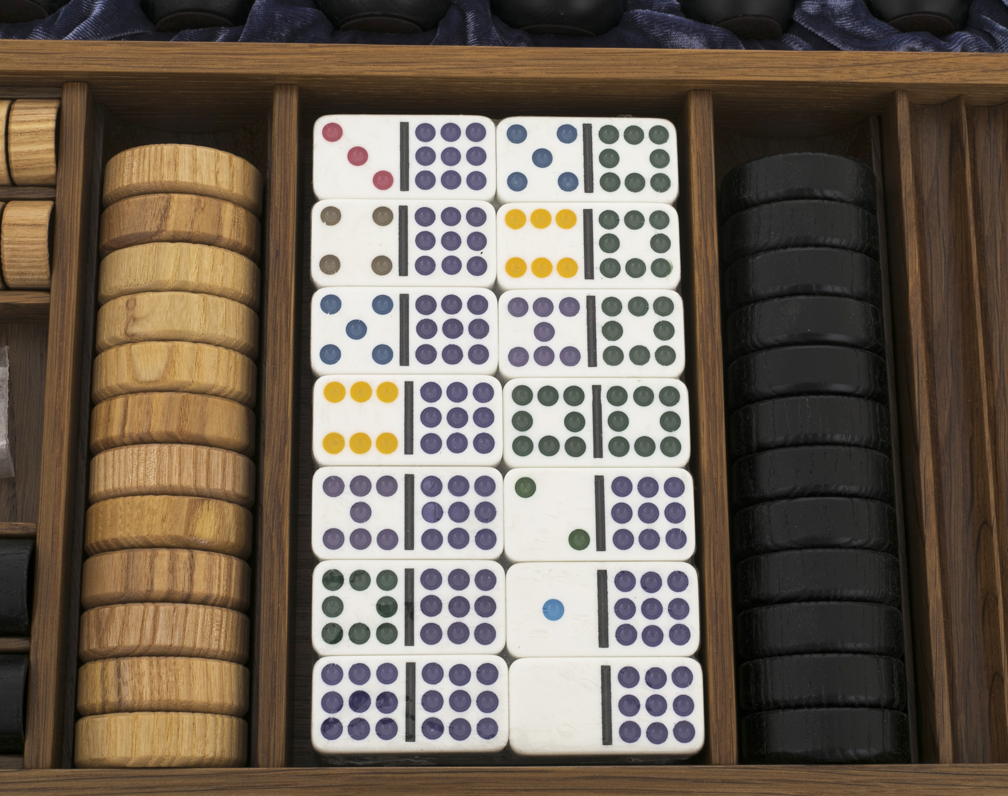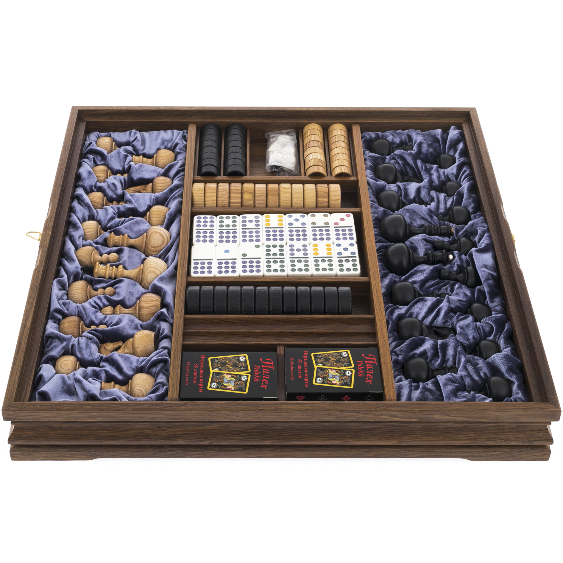 Комплектация:шахматные фигуры, шашки, фишки для игры в нарды, комплект из 55 костей домино (стандарт D-9), набор из пяти игральных костей и две колоды австрийских пластифицированных карт для игры в покер в стилистике Палеха.