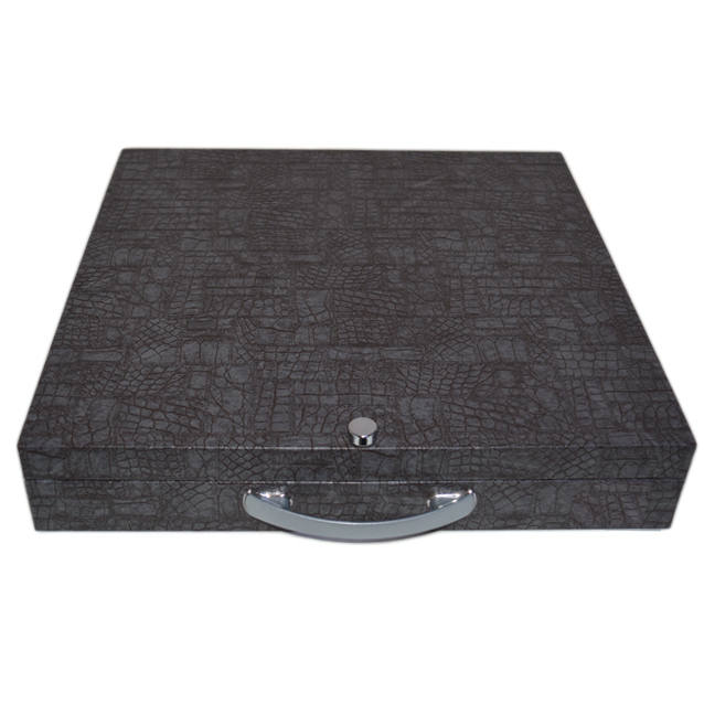 Для сцепки створок использованы металлические петли, которые были отлиты в специальной фигурной форме с нанесением узора. Крючок тоже является не просто элементом для запирания, а красивым дополнением к общему оформлению. Поле для шахмат и шашек выполнено методом резьбы, и немного возвышается. По краям створок имеется узор, как бы опоясывающий всю поверхность. Внутри слоты для фишек подчёркиваются каплевидным узором, а в центре разместились грозди винограда.