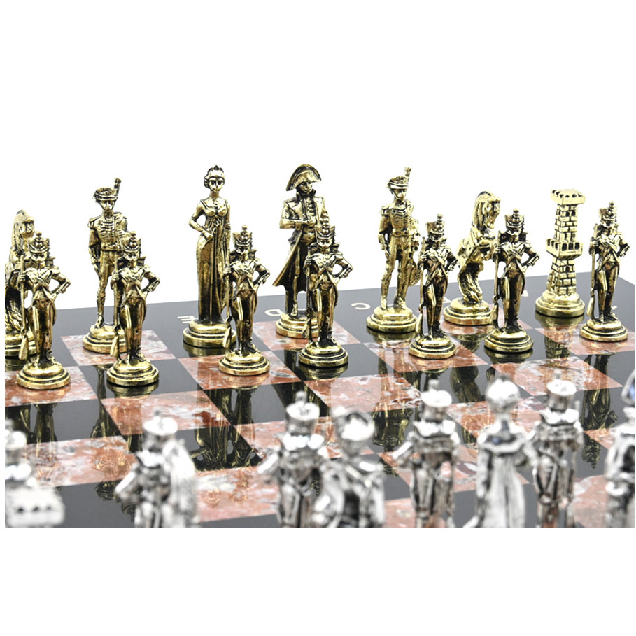Главным достоинством этого восхитительного сувенира являются узоры с элементами чернения, травления, никелирования и ручной подрезки. В результате гравировки появляются элегантные миниатюры, причудливые узоры и колоритные сюжетные зарисовки. Тончайшие детали каждой шахматной фигуры выполнены вручную с филигранной точностью.