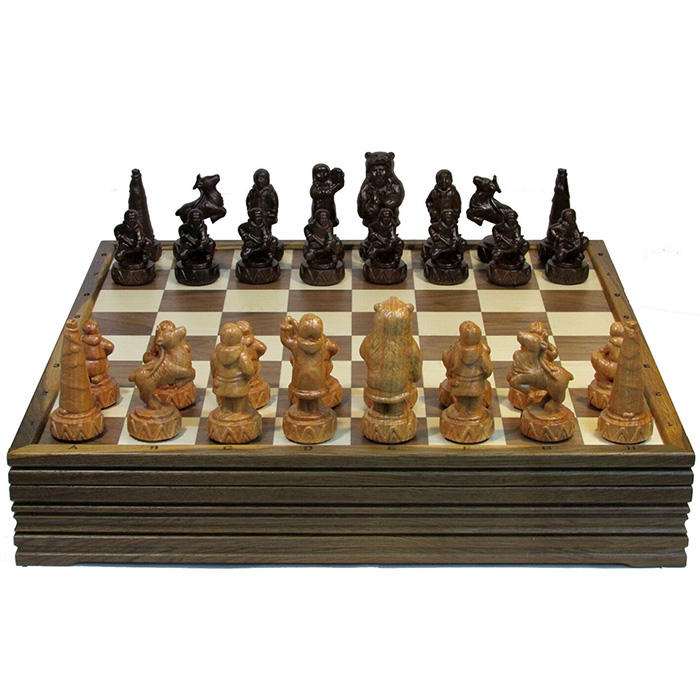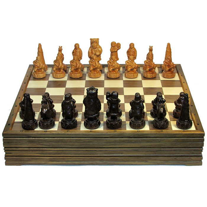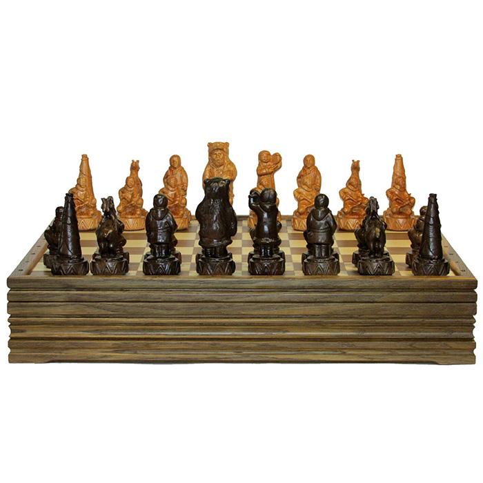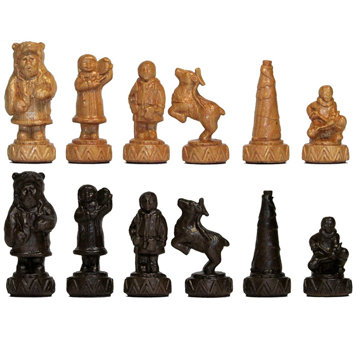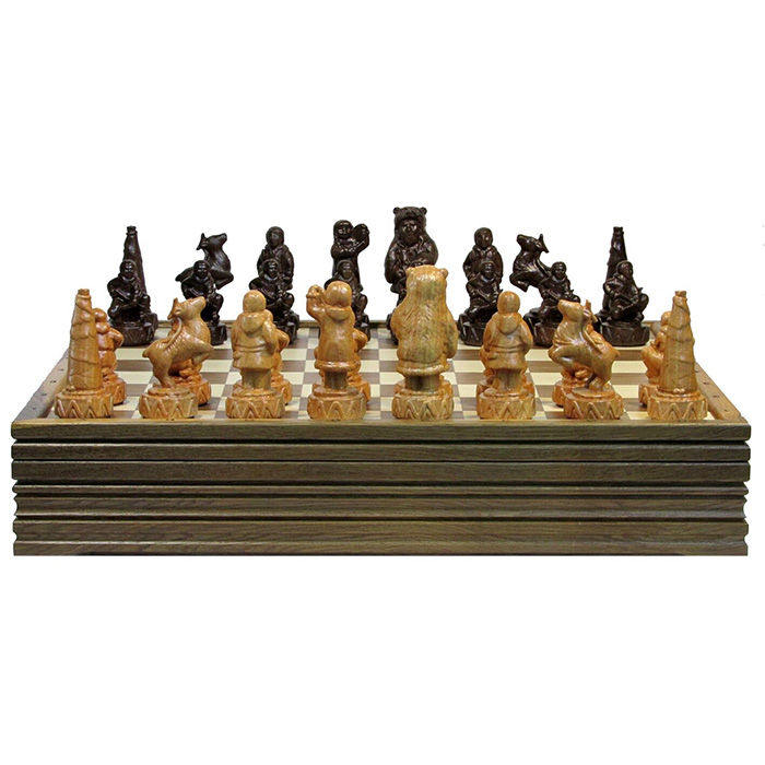 Шахматный комплект, посвящённый народам Севера, представляет собой не просто игру, а культурный артефакт, передающий дух арктической цивилизации в изысканно резной деревянной форме. Каждая фигура создана из массива: тёплая акация — для светлой стороны, благородный чёрный орех — для тёмной. Пропорции фигур идеальны: выразительная пластика, крупный размер и точные образы позволяют легко различать фигуры на поле, не теряя при этом эстетического удовольствия. В этих шахматах не просто слоны и ферзи — перед зрителем возникают шаманы, охотники, медведи и северные олени, словно сошедшие с иллюстраций к эпосу о жизни в вечной мерзлоте.