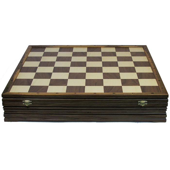 Игровое поле выполнено вручную из дуба — древесины, символизирующей надёжность и силу. Контрастная расцветка — чередование шпона американского ореха и клена — придаёт доске визуальную чёткость, подчёркивая ритм партии и облегчая восприятие игры. Размер доски — 56 на 56 сантиметров — обеспечивает просторное поле для манёвров. Каждый квадрат строго выверен, клетки размером 65 мм позволяют фигурам стоять с достоинством, не загромождая соседние ряды. По канту выгравирована координатная сетка, обращающаяся к шахматной традиции и упрощающая ведение аналитической партии.