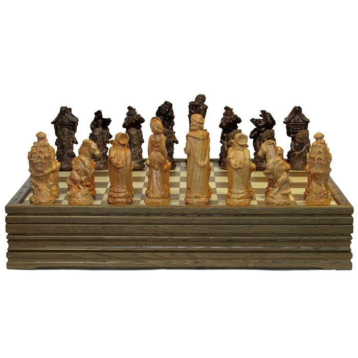 Набор «Сказка» — редкий образец резных шахмат, обращающийся не только к эстетическому вкусу, но и к культурной памяти. В каждом персонаже — от седого волшебника до избушки на курьих ножках — оживают образы русской сказочной традиции, ставшие аллегориями стратегического противостояния. Комплект собран из фигур, выполненных из массива двух пород: акации — для светлой стороны, черного ореха — для темной. Массивный размер придает каждой фигуре весомость, но при этом фигуры не утяжелены дополнительно, позволяя сохранить тактильную легкость. Высокий рельеф, тщательно проработанные черты, разнообразие форм — каждая фигура будто несет в себе маленькую драму.