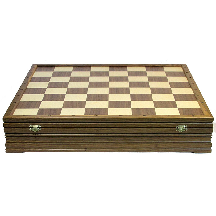 Игровое поле собрано вручную из шпона клена и ореха. Белые и темные клетки аккуратно сочетаются в единой мозаике на фоне доски из благородного дуба. Размер 56 на 56 см задает комфортное пространство для игры, а крупная клетка 65 на 65 мм обеспечивает превосходную читаемость поля даже при крупных объемных фигурах. Буквенная и цифровая индексация аккуратно нанесена по краю, подчеркивая как функциональность, так и стремление к классической точности. Внутри доски скрыт бархатный ложемент, выстланный глубоким синим велюром, обеспечивающий индивидуальное хранение каждой фигуры.
