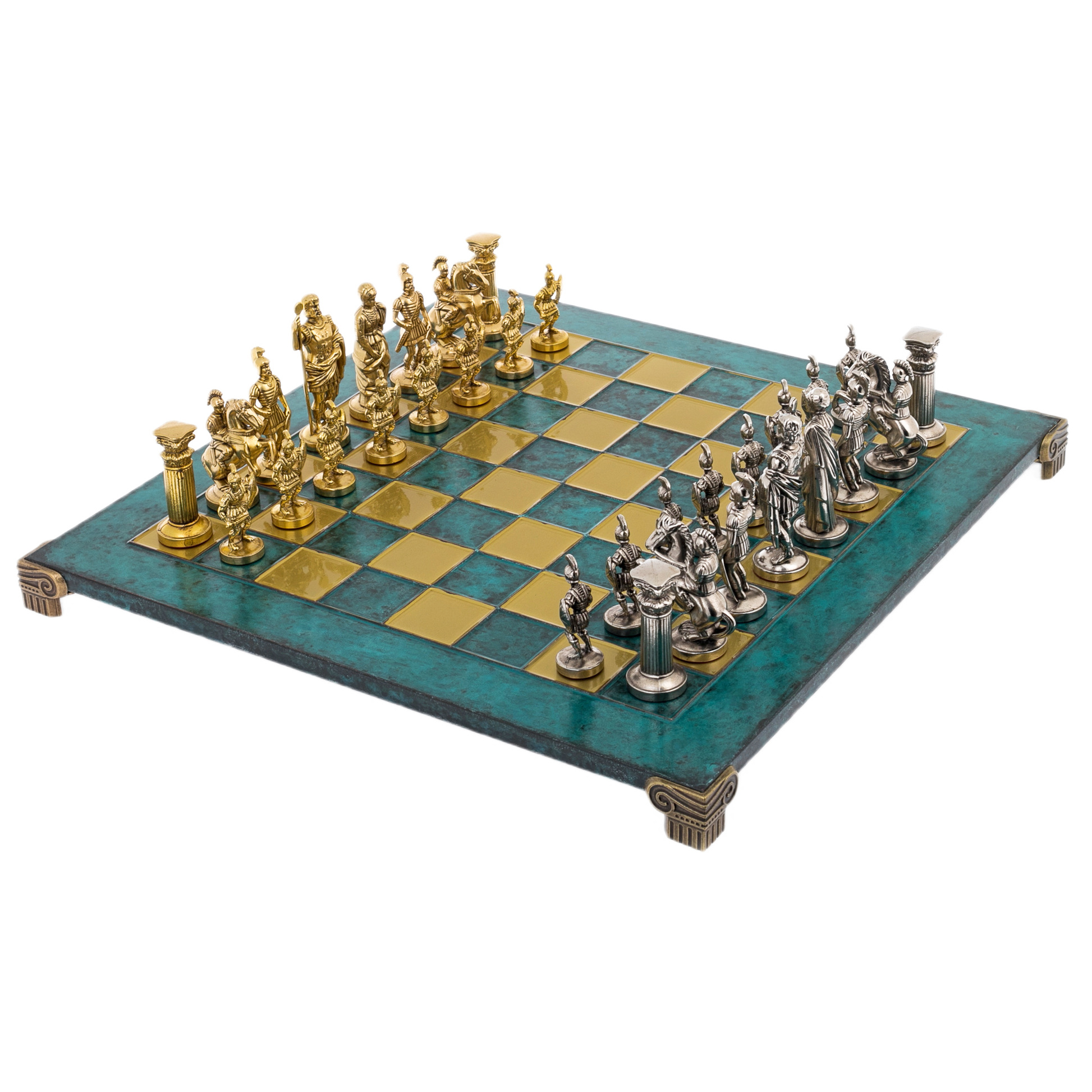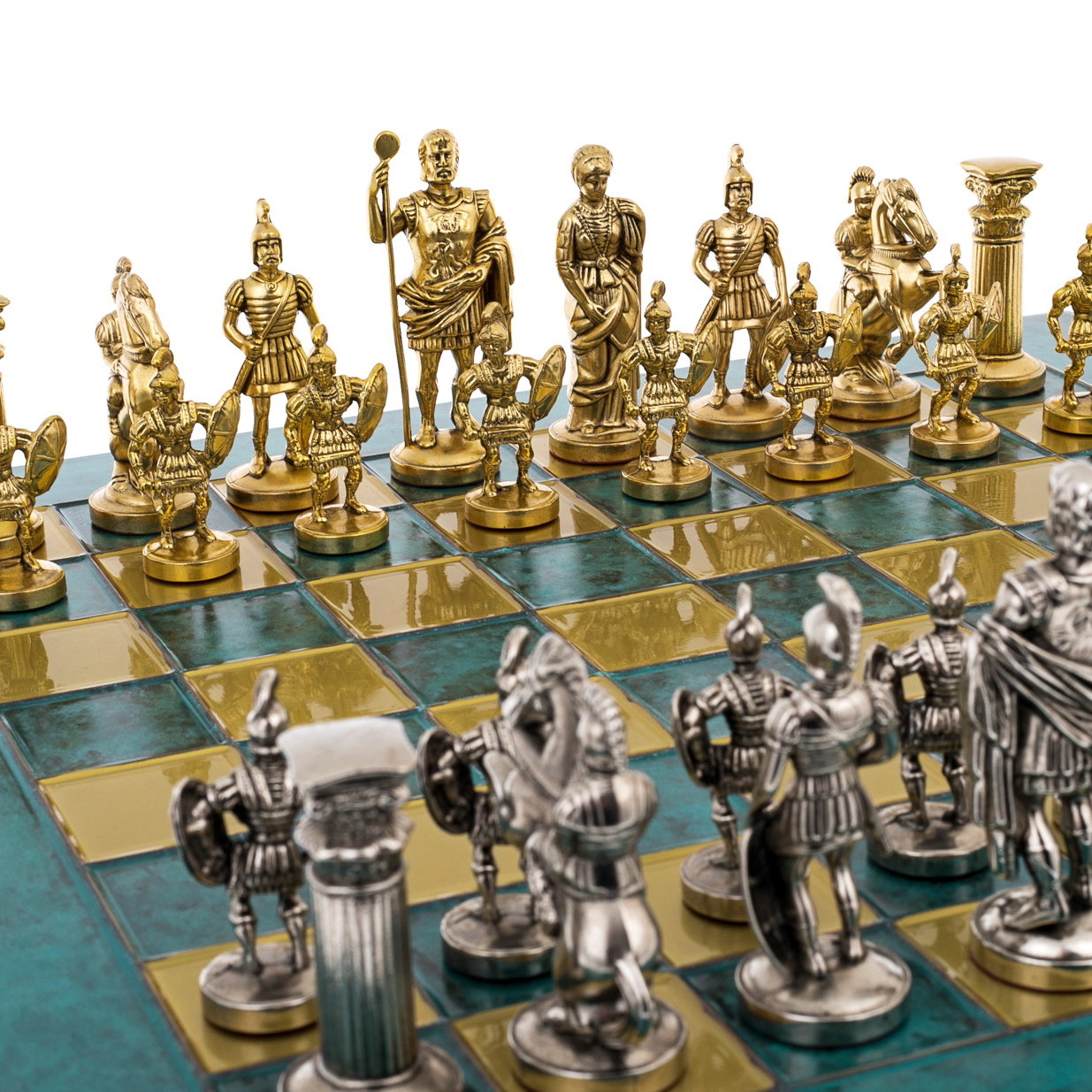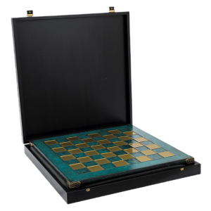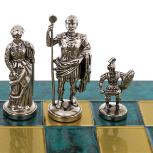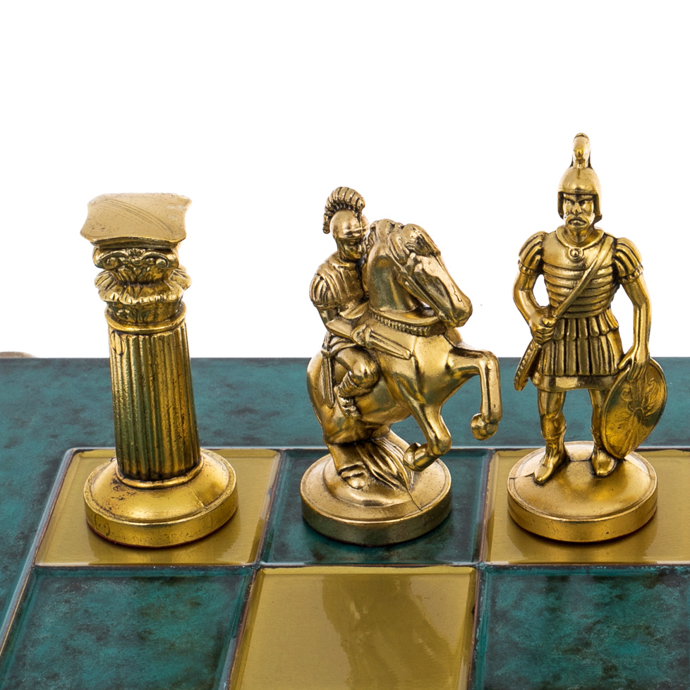 Фигуры выполнены из латуни с покрытием золотом и никелем, каждая из них — воплощение героев античности: мудрых философов, военачальников, императоров и доблестных легионеров. На клетчатом поле из зелёного малахитового тона разворачивается битва умов и воли, где тактика напоминает ходы древних стратегов, а эстетика — величие классической цивилизации.