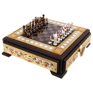 Главным достоинством этого восхитительного сувенира являются узоры с элементами чернения, травления, никелирования и ручной подрезки. В результате гравировки появляются элегантные миниатюры, причудливые узоры и колоритные сюжетные зарисовки. Тончайшие детали каждой шахматной фигуры выполнены вручную с филигранной точностью.
