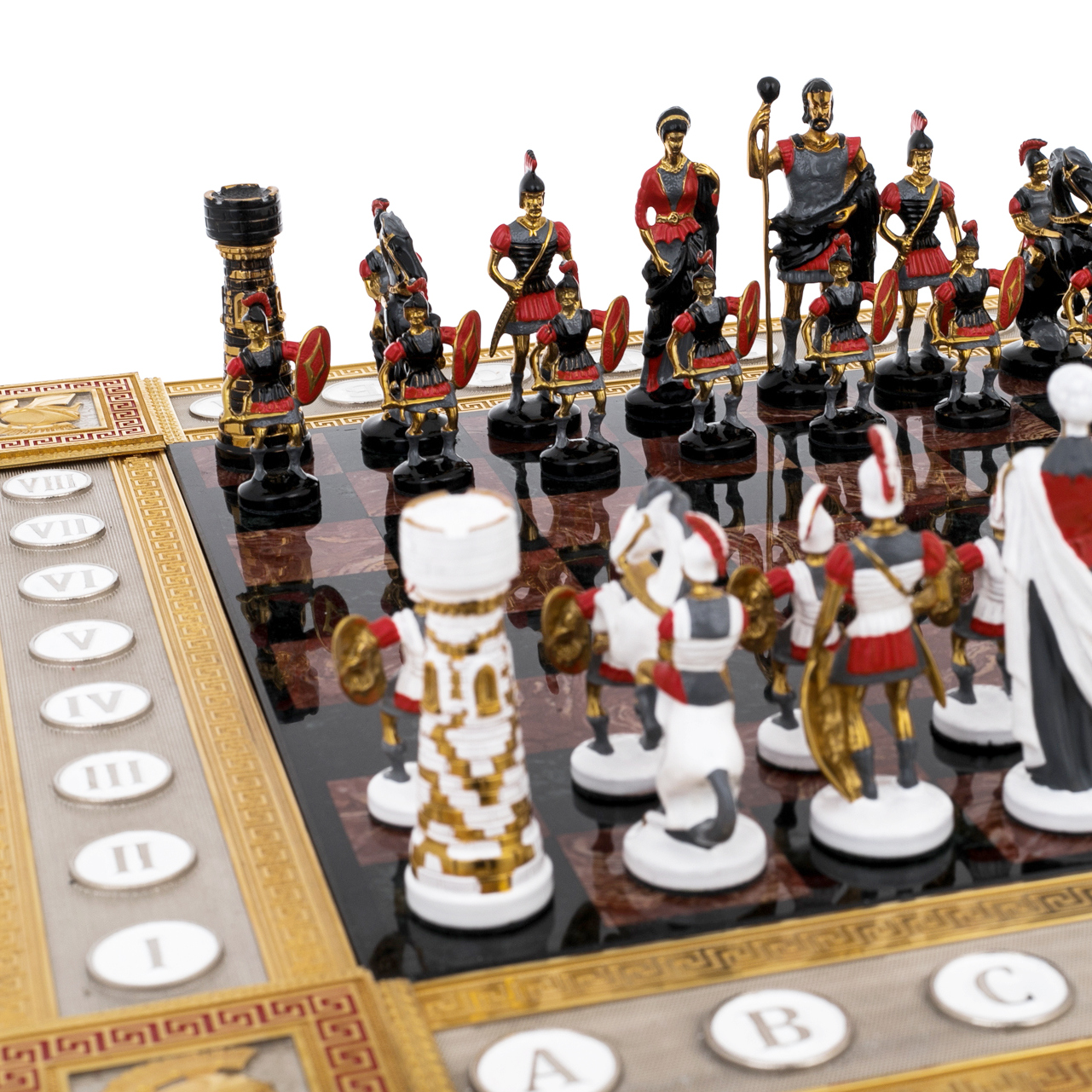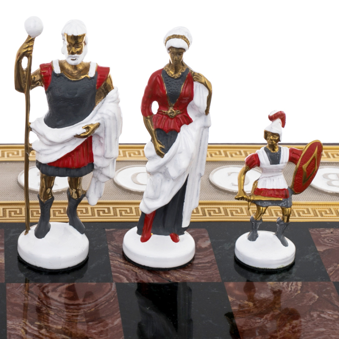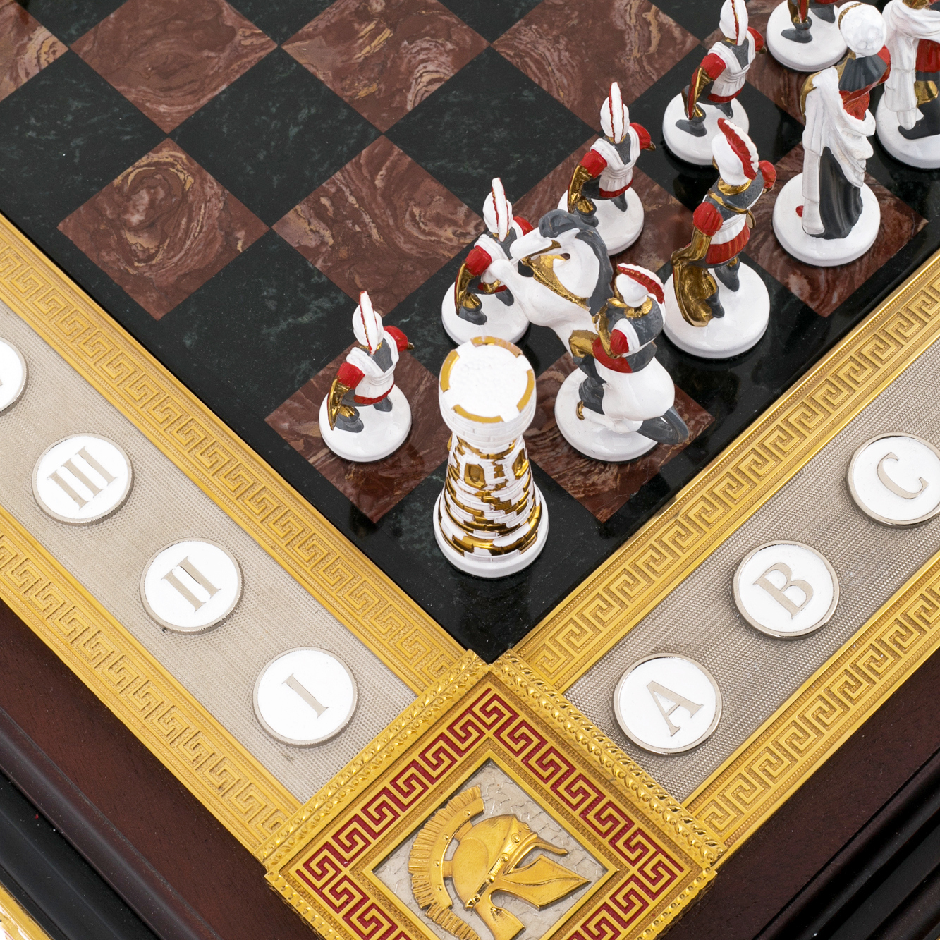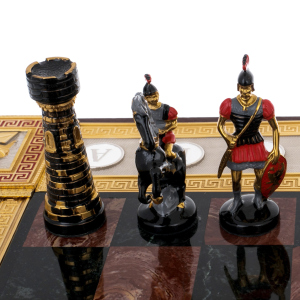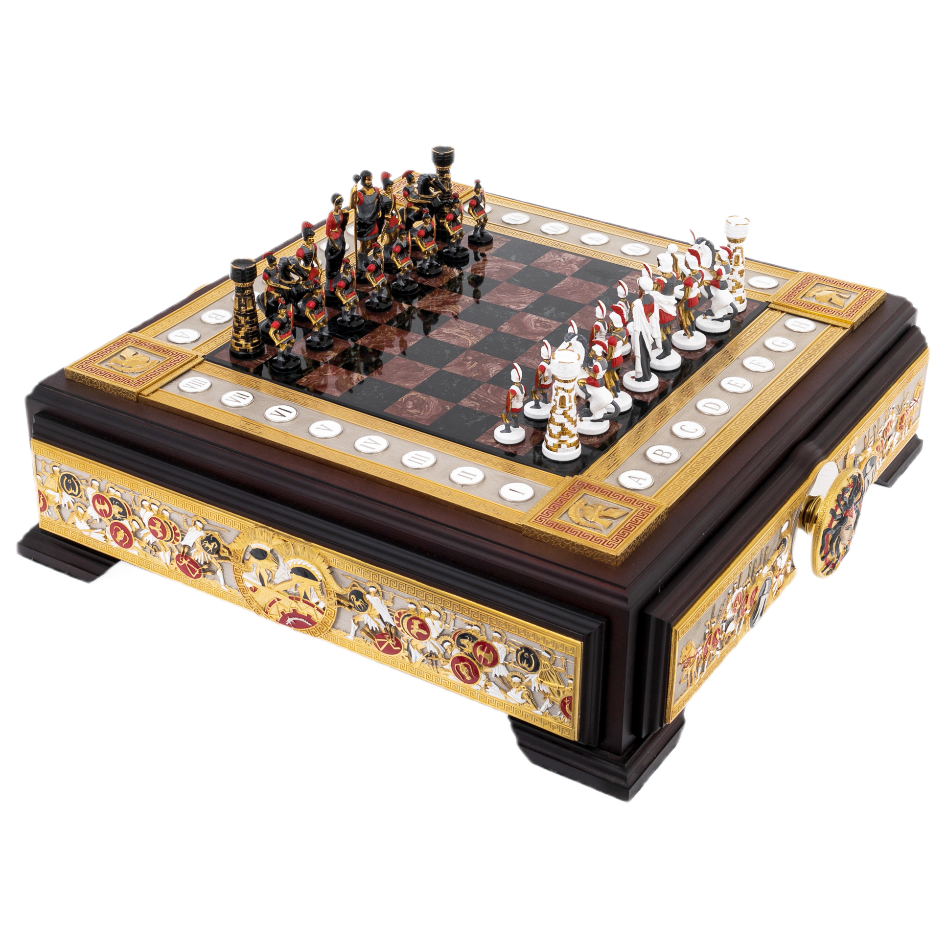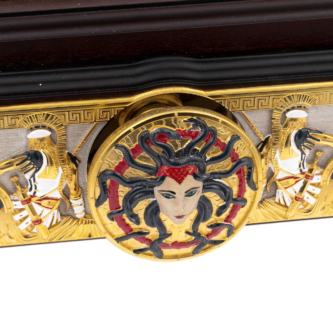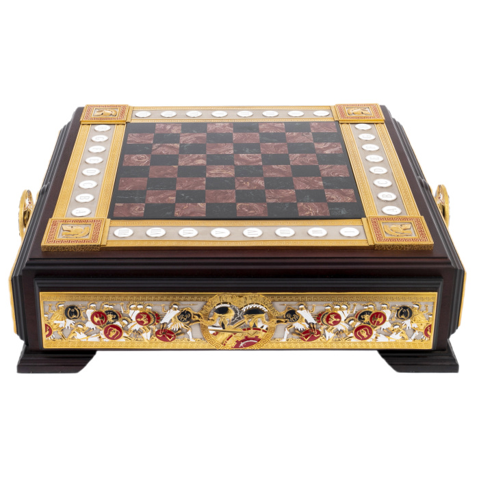 Шахматы из яшмы и долерита «Медуза Горгона», Златоуст — произведение, в котором искусство металла, камня и мифологии сливаются в гармоничное целое. Основание из тёмного долерита придаёт композиции вес и устойчивость, а инкрустации из яшмы наполняют игру живым мерцанием оттенков. На боковых панелях размещён рельефный декор с изображениями щитов, копий, античных шлемов и фигур Медузы — древнего символа мудрости, защиты и власти, обращающего всё неустойчивое в камень. Каждая деталь продумана: от позолоченных кантов до миниатюрных гербовых вставок, подчёркивающих торжественный характер работы.
