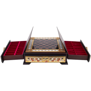 Шахматы выполнены в лучших традициях златоустовской школы декоративного оружейного искусства, где каждая линия гравировки несёт отпечаток руки мастера. Орнамент выведен вручную, фрагменты узора шлифованы и покрыты золотом, серебром и чернением, создающим сложную игру света. Внутренние выдвижные ящики отделаны бархатом глубокого рубинового цвета и предназначены для хранения фигур, каждая из которых выполнена из металла и расписана вручную эмалями. В контрасте чёрного и белого набор обретает характер мифологического противостояния света и тьмы, порядка и хаоса.