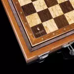 Корпус доски выполнен из африканского дерева - мербау, а тёмные и светлые клетки из массивов венге и карельской берёзы. Навершия у тёмного короля и ферзя выполнены из бивня мамонта, ценного материалы с тысячелетней историей, а на светлых фигурах используется африканский эбен. Фигуры удобны в игре и приятны в руках, они рождают ту особую атмосферу шахматной партии, когда классическая строгость сочетается с европейским изяществом.