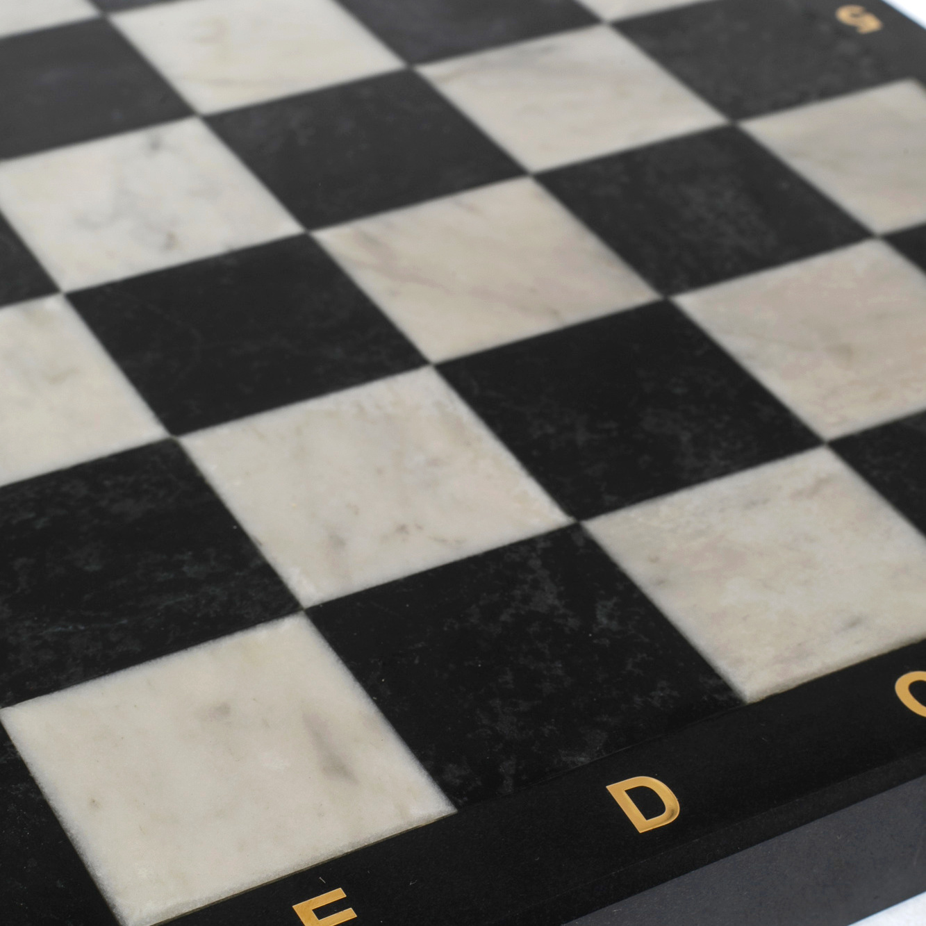 Благородно блестящая черно-белая мраморная доска олицетворяет контраст двух миров: света и тьмы, порядка и хаоса. Каждая клетка — это поле битвы, где интеллект и проницательность решают исход игры, подчеркивая власть над моментом и ситуацией. Мраморные фигуры, будто замершие в изысканной аристократичности, источают величие, достойное настоящего монарха, уверенного в своих силах и решениях.