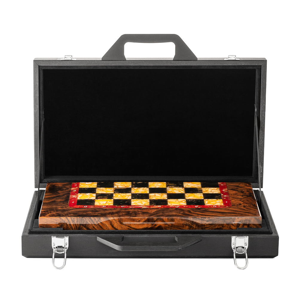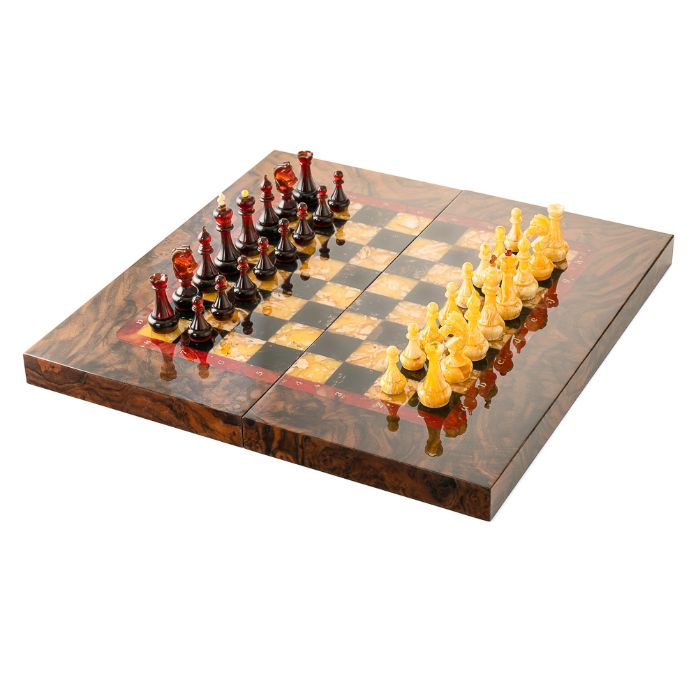 Безупречное качество и эксклюзивный дизайн элитных шахмат не оставят равнодушным истинного ценителя добротных и красивых вещей! Эти шахматы изготавливаются вручную из натурального янтаря в технике «Ковровская мозаика». Текстура материалов неповторима: невозможно изготовить двое совершенно одинаковых шахмат. Для изготовления игровой фурнитуры используется янтарный композит самых разных оттенков.