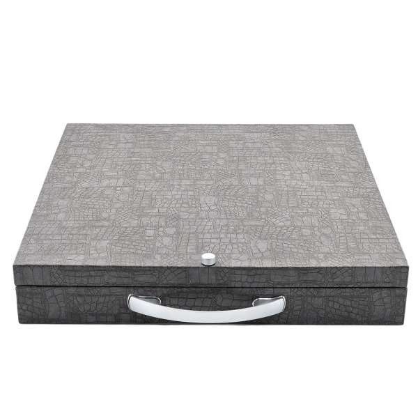 Для сцепки створок использованы металлические петли, которые были отлиты в специальной фигурной форме с нанесением узора. Крючок тоже является не просто элементом для запирания, а красивым дополнением к общему оформлению. Поле для шахмат и шашек выполнено методом резьбы, и немного возвышается. По краям створок имеется узор, как бы опоясывающий всю поверхность. Внутри слоты для фишек подчёркиваются каплевидным узором, а в центре разместились грозди винограда.