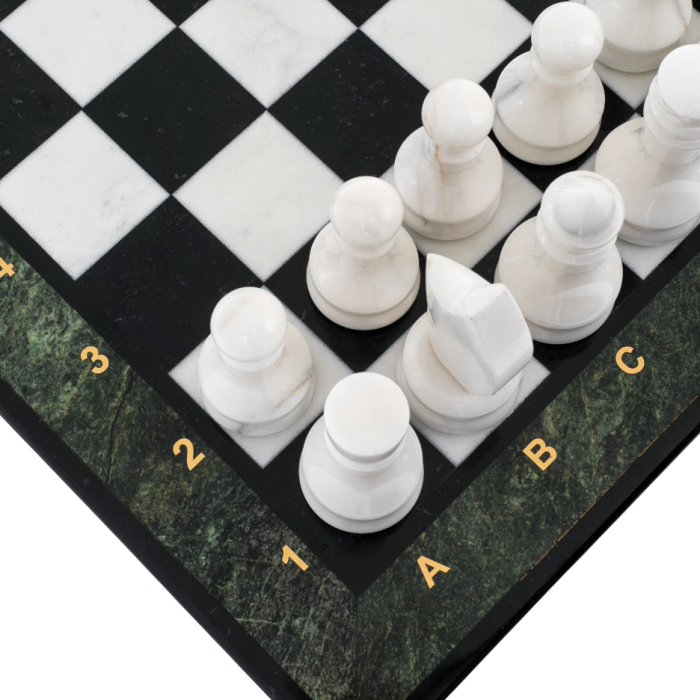 Каждая фигура выточена вручную из цельного камня, отполирована до зеркального блеска и сохраняет природную структуру минерала. Белые — из мрамора, чистого и светлого, словно символ открытой мысли; чёрные — из долерита, плотного, насыщенного, с металлическим отливом, воплощающего волю и расчёт. Такое сочетание материалов придаёт игре особую энергетику: ходы ощущаются физически, а звук фигуры, касающейся поля, становится частью ритуала.