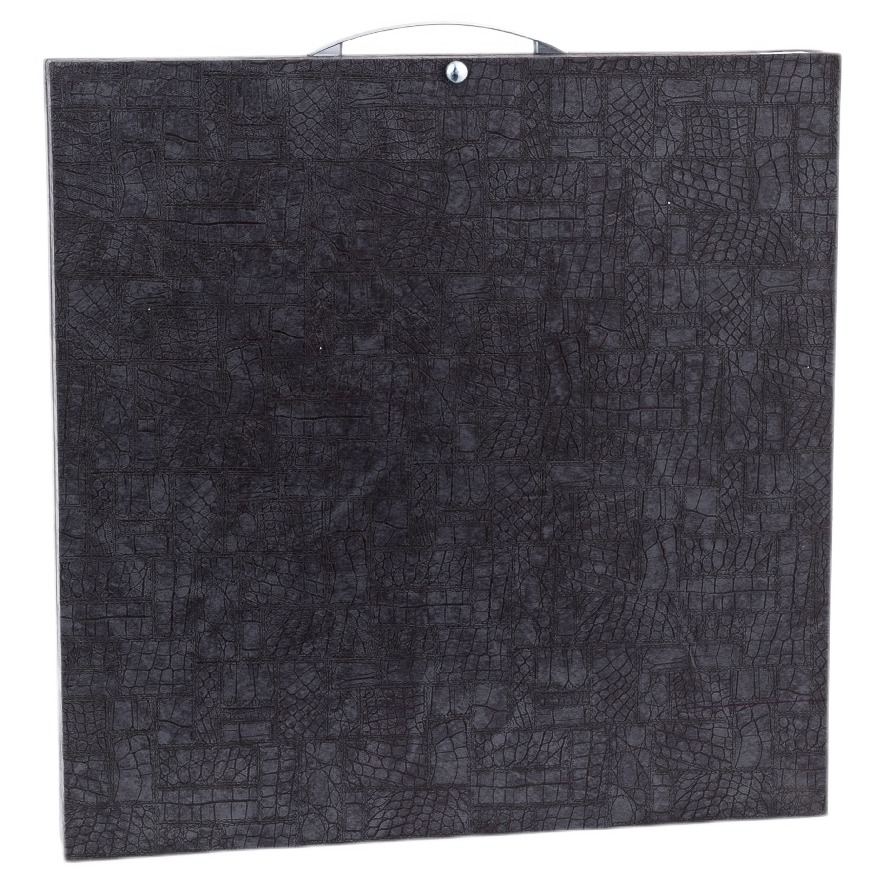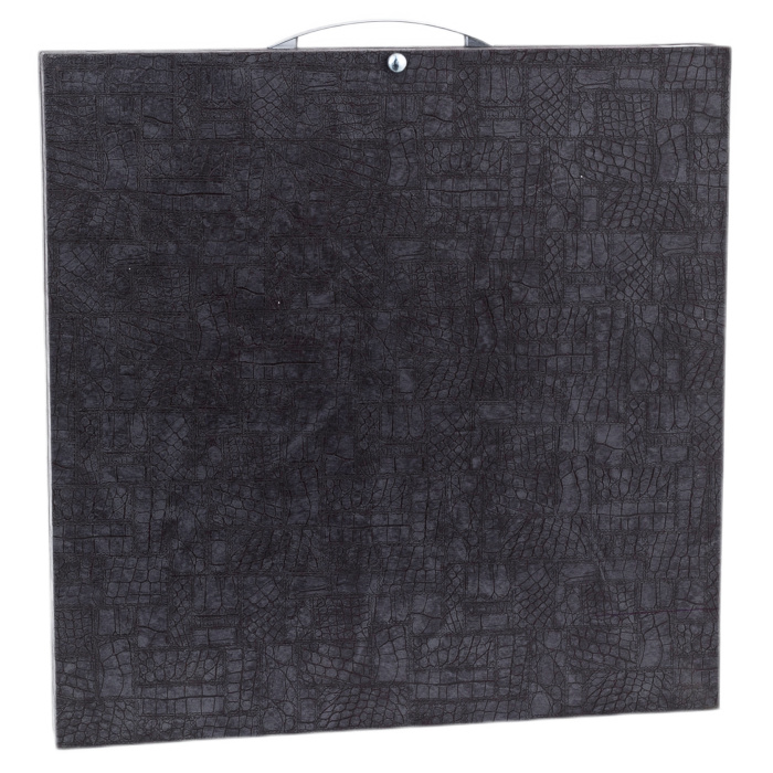 Для сцепки створок использованы металлические петли, которые были отлиты в специальной фигурной форме с нанесением узора. Крючок тоже является не просто элементом для запирания, а красивым дополнением к общему оформлению. Поле для шахмат и шашек выполнено методом резьбы, и немного возвышается. По краям створок имеется узор, как бы опоясывающий всю поверхность. Внутри слоты для фишек подчёркиваются каплевидным узором, а в центре разместились грозди винограда.