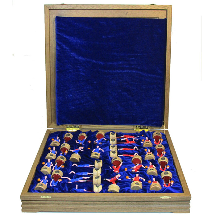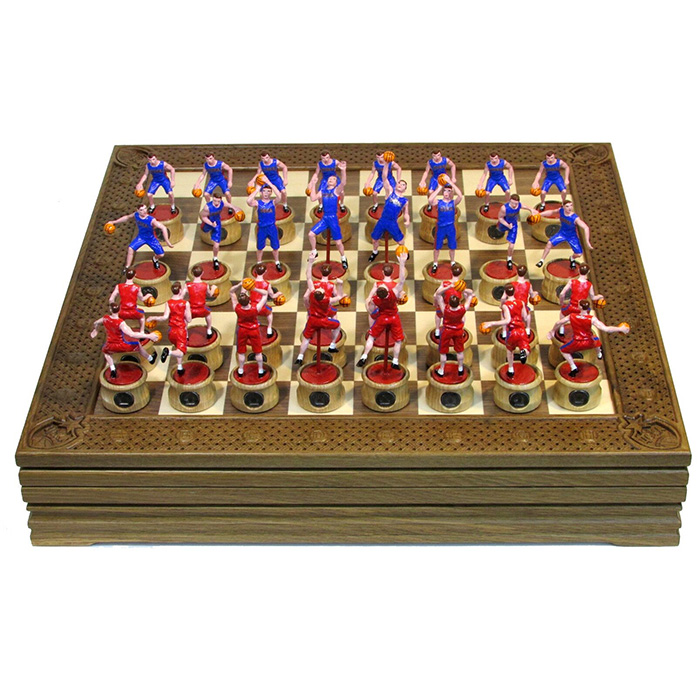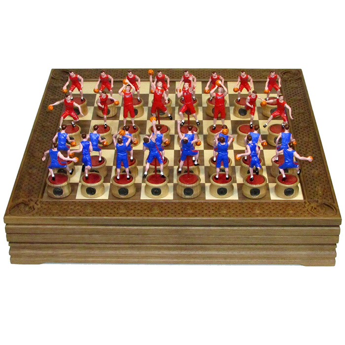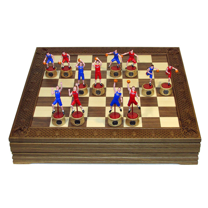 Шахматные фигуры отлиты из цинкового сплава, обладающего идеальным балансом между весом и прочностью. Поверхность каждой миниатюры расписана вручную в полуколлекционном качестве, в точности передающем игровые моменты баскетбольного матча. Сдержанная цветовая гамма форм домашней и гостевой команд оживляет партию, создавая иллюзию настоящего противостояния. Основания фигур выполнены из ценных пород дерева и снабжены с обеих сторон миниатюрными знаками, обозначающими тип фигуры, что делает ориентирование на доске интуитивно понятным и эстетически привлекательным.