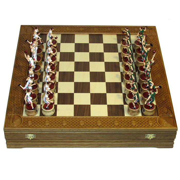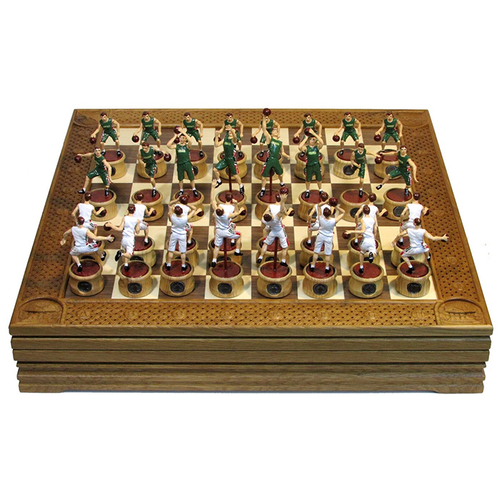 Шахматные фигуры отлиты из цинкового сплава, обладающего идеальным балансом между весом и прочностью. Поверхность каждой миниатюры расписана вручную в полуколлекционном качестве, в точности передающем игровые моменты баскетбольного матча. Сдержанная цветовая гамма форм домашней и гостевой команд оживляет партию, создавая иллюзию настоящего противостояния. Основания фигур выполнены из ценных пород дерева и снабжены с обеих сторон миниатюрными знаками, обозначающими тип фигуры, что делает ориентирование на доске интуитивно понятным и эстетически привлекательным.