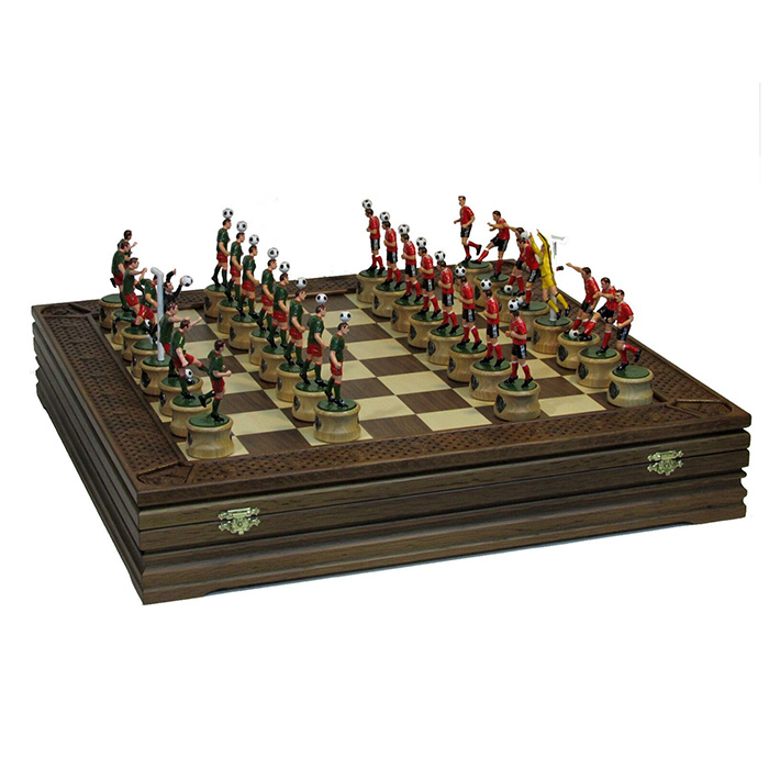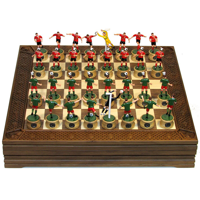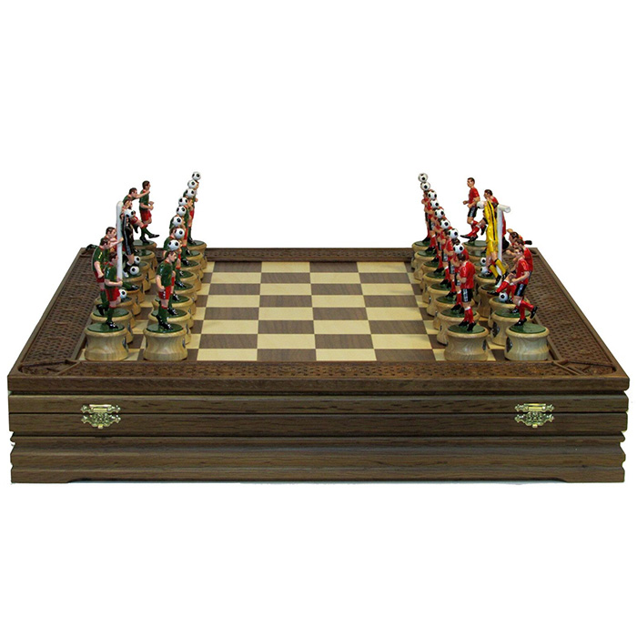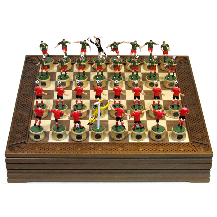Внутри доски — индивидуальные ячейки из мягкого бархата, заботливо оберегающие каждую миниатюру в пути. Комплект поставляется в транспортной коробке, достойной его класса. Этот набор предназначен для тех, кто с одинаковой страстью любит и футбол, и игру королей, для тех, кто умеет ценить детали, традиции и ручной труд, заключённый в по-настоящему элитный предмет — весомый и ироничный подарок себе или другу, у которого уже есть всё.