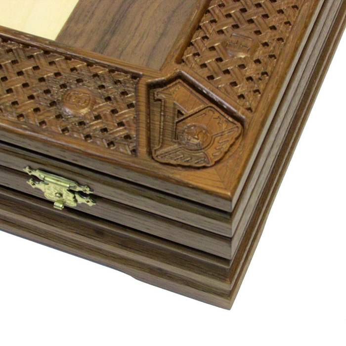 Игровое поле выложено вручную из квадратов шпона клёна и американского ореха, изящно чередующихся в шахматном порядке. Резная доска выполнена из массива черного дуба — мощного, плотного, долговечного. Углы украшают объемные эмблемы клуба, как дань традиции, как знак памяти о великих матчах, пережитых победах и надеждах. Размер клетки — 46,5 миллиметров, размеры доски — 49 на 49 сантиметров. Поле дополнено буквенной и цифровой маркировкой — функциональной и деликатной.